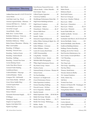 Arabian Horse Assn.AZ..1, 10, 27, 57, 61, 67, 69Arena Works . . . . . . . . . . . . . . . . . . . . .19Arid State Land/Ag - Wood . . . . . . . .88Arizona Legends Realty - Ellerman . .97Arizona MD Barn Co. - Zarbock . . .8, 9Arizona QH Assn. of AZ . . . . . . . . . . .68Art of the Cowgirl . . . . . . . . . . . . . . . .35Award Realty - Abare . . . . . . . . . . . . . . . .84Bella Terra - LeAnn/Hank . . . . . . . . .80Berkshire Hathaway - Donovan . . . . .78Berkshire Hathaway - Kort . . . . . . . . .99Berkshire Hathaway - Wilms . . . . . . . .3Better Homes/Bloomtree - Wherley .76Billy Cook Saddles . . . . . . . . . . . . . . . .30Boarding - El Milagro . . . . . . . . . . . . . .14Boarding - Prescott Area . . . . . . . . . . .73Boarding - Nashwa Farms . . . . . . . . .33Boarding - Santori Ranch . . . . . . . . . .56Boarding - Stallings . . . . . . . . . . . . . . .26Boarding - Twisted Tree Farm . . . . . .54Cactus Reining Classic . . . . . . . . . . . . .65Carla Cline Show Horses . . . . . . . . . .63Carousel Trails Hauling . . . . . . . . . . . .40Castlebrook Barns . . . . . . . . . . . . . . . . .11Coldwell Banker - Mayorga . . . . . . . .87Coldwell Banker - Weeks . . . . . . . . . .83Compass TSG - McDonald . . . . . . . . .84Core Choice Realty - McNicol . . . . .101Crazy Horse Saddle Shop . . . . . . . . . .45Custom Equine Barn . . . . . . . . . . . . . .21Dalton Hay Co. . . . . . . . . . . . . . . . . . . .17Desert Saddlery . . . . . . . . . . . . . . . . . .50Dusty A Ranch . . . . . . . . . . . . . . . . . . . .56Dynamite Horseman Supply . . . .52, 53El Milagro . . . . . . . . . . . . . . . . . . . . . . .14Emergency Ready+ . . . . . . . . . . . . . . .34Empire Cat Agriculture . . . . . . . . . . . .29Equine Colic Relief USA . . . . . . . . . . .12Equine Leg Magic . . . . . . . . . . . . . . . . .55Farm Bureau Financial Services . . . .104Fathom Realty - Cohen/Marsillo . . . .82First United - Ryan . . . . . . . . . . . . . . .6, 7Gifford Equine Appraiser . . . . . . . . . .40Greenway Saddlery . . . . . . . . . . . . . . .13Hershberger Performance Horse Sale . .51High Desert Buildings & Barns . . . . . .2High Desert Creations . . . . . . . . . . . . .60HomeSmart - Abbott . . . . . . . . . . .74, 75HomeSmart - Pinkerton . . . . . . . . .46, 47Horses With Heart . . . . . . . . . . . . . . . .44Iannelli - Carlin . . . . . . . . . . . . . . . . . . .80Ianneli - Watne . . . . . . . . . . . . . . . . . . .97Interactive Equine Bodywork . . . . . . .64Jeffrey Wilms Training & Mgmt. Inc...103Keller Williams - Cox . . . . . . . . . . . . . .89Keller Williams - Crissman . . . . . . . . .92Keller Williams - Hanna . . . . . . . . . . .90Laurie M. Gosney Real Estate . . . . . . .95LMW Horsemanship . . . . . . . . . . . . . .66Long Realty - Vondrak . . . . . . . . . . . . .93Lori Blank & Assoc. - Jensen . . . . . . .100Michelle Mills Photography . . . . . . . .62Miller High Performance Horses . . . .42My Home Group - Souers . . . . . . . . . .99Nashwa Farms . . . . . . . . . . . . . . . . . . .33National Realty of Arizona - Thomas 88Nelson Farms . . . . . . . . . . . . . . . . . . . . .5No Dust Bedding . . . . . . . . . . . . . . . . .58Nymeyer’s at Tanglewood . . . . . . . . .42Owen Performance Horses . . . . . . . . .71Palm Equestrian Academy . . . . . . . . .38Pasture Boarding/Stallings . . . . . . . . .26Prescott Luxury - DeVries . . . . . . . . . .81R.O.I. Properties - Schmidt . . . . . . . . .92Rancho Sonado . . . . . . . . . . . . . . . . . . .36Realty Expressions - Zeiler . . .20, 96, 98, 100Realty One Group - Edwards . . . . . . . . . . .91Realty One Group - Rafters . . . . . .76, 77Realty One Group - Richardson . . . . 79ReMax - Burke . . . . . . . . . . . . . . . . . . .43Resona Health - Vibe . . . . . . . . . . . . . .64Rid O Rock . . . . . . . . . . . . . . . . . . . . . . .15Robin Hoods . . . . . . . . . . . . . . . . . . . . .18Robinson Ranch . . . . . . . . . . . . . . . . . .72Rock Solid Frames . . . . . . . . . . . . . . . .28Rose Law Group pc . . . . . . . . . . . . . . .16Russ Lyon - Brasher/Flaherty . . . . . .37Russ Lyon - Miller . . . . . . . . . . . . . . . .41Russ Lyon - Omundson . . . . . . . . . . . .31Russ Lyon - Pakula . . . . . . . . . . . . .22, 23Russ Lyon - Winnicki . . . . . . . . . . . . .100Sacate Pellet Mills, Inc. . . . . . . . . . . . .59Saddle Up Realty - Serrano . . . . . . . . .88Santori Ranch . . . . . . . . . . . . . . . . . . . .56Scottsdale Arab Show1, 10, 27, 57, 61, 67, 69Service First Realty - Graves . . . . . . . . . . . .101Service First Realty - Jones/Bowles . . . . . . .94Southwest Building Solutions . . . . . . . . .39Stallings/Pasture Boarding . . . . . . . . .26Stallings, Kevin Perf. Horses . . . . . . .49Steel Erection Maintenance, Inc. . . . . .25Sun Country Circuit QH Show . . . . . .68T & P Boarding . . . . . . . . . . . . . . . . . . .73Tack Et Cetera . . . . . . . . . . . . . . . . . . . .20The Chap Lady . . . . . . . . . . . . . . . . . . .60The Group - Spaulding . . . . . . . . . . . .86The Hay Pillow . . . . . . . . . . . . . . . . . . .24Thomas, Heidi Books . . . . . . . . . . . . . .48Thwaits, Bonnie & Shelby . . . . . . . . . .56TLC Animal Nutrition . . . . . . . . . . . . .34Trenk, Adam, Esq. . . . . . . . . . . . . . . . .16Tuff-Kote . . . . . . . . . . . . . . . . . . . . . . . .32Twisted Tree Farm . . . . . . . . . . . . . . . .54Western AZ Ranch/RE - Pendergast .99Wildemeyer Gallery . . . . . . . . . . . . . . .70Young Realty Partners - Zeising . . . . .85Autism Savant . . . . . . . . . . . . . . . . . . . . .5Cactus Quixote . . . . . . . . . . . . . . . . . . .42Lotsa Lightnin Bolts . . . . . . . . . . . . . . . .5Vernons Venom . . . . . . . . . . . . . . . . . . 42Advertisers' Directory102 Arizona Horse Connection February, 2026Stallion Directory
