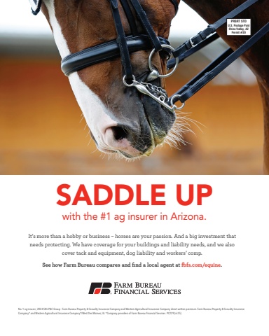 with the #1 ag insurer in Arizona.SADDLE UPIt’s more than a hobby or business – horses are your passion. And a big investment that needs protecting. We have coverage for your buildings and liability needs, and we also cover tack and equipment, dog liability and workers’ comp.See how Farm Bureau compares and find a local agent at fbfs.com/equine.No. 1 ag insurer; 2024 SNL P&C Group - Farm Bureau Property & Casualty Insurance Company and Western Agricultural Insurance Company direct written premium. Farm Bureau Property & Casualty Insurance Company* and Western Agricultural Insurance Company*/West Des Moines, IA. *Company providers of Farm Bureau Financial Services. PC229 (6-25)PRSRT STDU.S. Postage PaidChino Valley, AZPermit #20