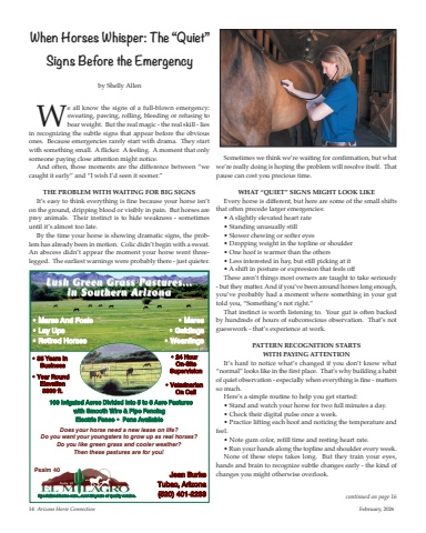 We all know the signs of a full-blown emergency:sweating, pawing, rolling, bleeding or refusing tobear weight. But the real magic - the real skill - liesin recognizing the subtle signs that appear before the obviousones. Because emergencies rarely start with drama. They startwith something small. A flicker. A feeling. A moment that onlysomeone paying close attention might notice.And often, those moments are the difference between “wecaught it early” and “I wish I’d seen it sooner.”The Problem WiTh WaiTing For big SignSIt’s easy to think everything is fine because your horse isn’ton the ground, dripping blood or visibly in pain. But horses areprey animals. Their instinct is to hide weakness - sometimesuntil it’s almost too late.By the time your horse is showing dramatic signs, the problem has already been in motion. Colic didn’t begin with a sweat.An abscess didn’t appear the moment your horse went threelegged. The earliest warnings were probably there - just quieter.Sometimes we think we’re waiting for confirmation, but whatwe’re really doing is hoping the problem will resolve itself. Thatpause can cost you precious time.WhaT “QuieT” SignS mighT look likeEvery horse is different, but here are some of the small shiftsthat often precede larger emergencies:• A slightly elevated heart rate• Standing unusually still• Slower chewing or softer eyes• Dropping weight in the topline or shoulder• One hoof is warmer than the others• Less interested in hay, but still picking at it• A shift in posture or expression that feels offThese aren’t things most owners are taught to take seriously- but they matter. And if you’ve been around horses long enough,you’ve probably had a moment where something in your guttold you, “Something’s not right.”That instinct is worth listening to. Your gut is often backedby hundreds of hours of subconscious observation. That’s notguesswork - that’s experience at work.PaTTern recogniTion STarTS WiTh Paying aTTenTionIt’s hard to notice what’s changed if you don’t know what“normal” looks like in the first place. That’s why building a habitof quiet observation - especially when everything is fine - mattersso much.Here’s a simple routine to help you get started:• Stand and watch your horse for two full minutes a day.• Check their digital pulse once a week.• Practice lifting each hoof and noticing the temperature andfeel.• Note gum color, refill time and resting heart rate.• Run your hands along the topline and shoulder every week.None of these steps takes long. But they train your eyes,hands and brain to recognize subtle changes early - the kind ofchanges you might otherwise overlook.When Horses Whisper: The “Quiet”Signs Before the Emergencyby Shelly Allencontinued on page 1614 Arizona Horse Connection February, 2026Jean Burke Tubac, Arizona(520) 401-2233• 24 Hour On-Site Supervision• Veterinarian On CallSpecialized horse care...over 20 years of quality service.Psalm 40Lush Green Grass Pastures... Lush Green Grass Pastures...in Southern Arizona in Southern Arizona• Mares • Geldings• Weanlings• Mares And Foals• Lay Ups• Retired Horses• 35 Years In Business• Year RoundElevation 3300 ft.Does your horse need a new lease on life? Do you want your youngsters to grow up as real horses? Do you like green grass and cooler weather? Then these pastures are for you!100 Irrigated Acres Divided Into 5 to 6 Acre Pastureswith Smooth Wire & Pipe FencingElectric Fence • Pens Available