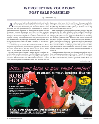 As a horseman, I hold conflicting beliefs about how to handlethe sale of a horse. If we raise them, we owe them a dutynot to exploit them at their peril. If we train them and workwith them, and they give something of themselves to us, either byteaching us a lesson or creating an emotional bond, I think we owethem a duty to ensure their proper care. However, I also recognizethat not every horse is suitable for any given purpose, and I believestrongly in the inalienable right to trade and conduct business in ourcapitalist economy. There are times when it is personally difficult tosync these interests. But, inevitably, horses must be bought and sold.So, how do we ensure their well-being, even after we have dispossessed of them? As an attorney by trade, I am often confronted with the sad storiesand personal quandaries of people who felt aggrieved by the transferof a horse, despite the fact that they did not own it. What? Thinkabout it. It is a common theme in the horse community. Person A sells or gives a horse to Person B. Person B (perhaps immediately, but sometimes months or years later) decides to sell or givethe horse away to Person C. Person B was rightfully and lawfully inpossession of the horse at the time of the transfer to Person C. PersonB had incurred expenses to care for the Horse, and, of course, was thelegal owner of the horse. Yet, Person A is now distraught, maybe because they are concerned for the well being of the horse, often becausethey felt they should have had the right to get the horse back or stopthe transfer of the horse to Person C. There are a number of reasons why someone, Person A, may feelaggrieved after they sell or gift a horse to Person B and Person B thentransfers it to the third-party Person C. Many times, Person A includeda language they hoped would apply in such situations when draftingthe Purchase Agreement or Bill of Sale that was used to memorializethe sale of the horse to Person B. The use of contractual language intended to give Person A rights to a horse post sale is not uncommon.It is often considered a mechanism Person A could use to ensure thehorse is well cared for. Such language ostensibly gives Person A theright of first refusal in the event Person B decides to sell, the right toobject to the sale of the horse to a third party on certain grounds, orotherwise. Language granting the Person A, or the transferor rights of first refusal, and language creating requirements for Person B, the transferee,to return a horse to its transferor should the transferee wish to rid himself of it, is not uncommon in purchase agreements and bill of sale docIS PROTECTING YOUR PONY POST SALE POSSIBLE?by Adam Trenk, Esq.18 Arizona Horse Connection February, 2026continued on page 20