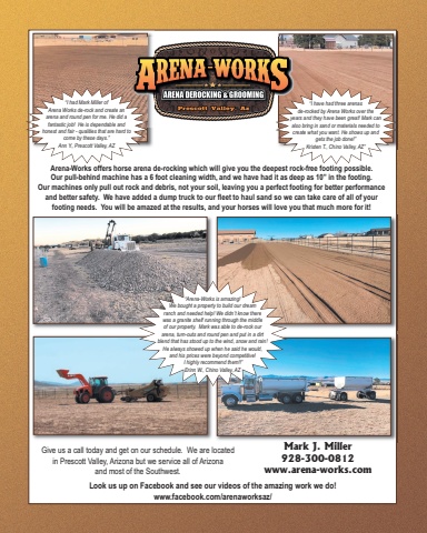 Mark J. Miller 928-300-0812www.arena-works.comArena-Works offers horse arena de-rocking which will give you the deepest rock-free footing possible. Our pull-behind machine has a 6 foot cleaning width, and we have had it as deep as 10” in the footing. Our machines only pull out rock and debris, not your soil, leaving you a perfect footing for better performance and better safety. We have added a dump truck to our fleet to haul sand so we can take care of all of your footing needs. You will be amazed at the results, and your horses will love you that much more for it!Look us up on Facebook and see our videos of the amazing work we do!www.facebook.com/arenaworksaz/Give us a call today and get on our schedule. We are located in Prescott Valley, Arizona but we service all of Arizona and most of the Southwest.“I had Mark Miller of Arena Works de-rock and create an arena and round pen for me. He did a fantastic job! He is dependable and honest and fair - qualities that are hard tocome by these days.”Ann Y., Prescott Valley, AZ“I have had three arenas de-rocked by Arena Works over the years and they have been great! Mark canalso bring in sand or materials needed to create what you want. He shows up andgets the job done!” Kristen T., Chino Valley, AZ”“Arena-Works is amazing! We bought a property to build our dream ranch and needed help! We didn’t know there was a granite shelf running through the middle of our property. Mark was able to de-rock our arena, turn-outs and round pen and put in a dirt blend that has stood up to the wind, snow and rain!He always showed up when he said he would, and his prices were beyond competitive! I highly recommend them!!”Erinn W., Chino Valley, AZ