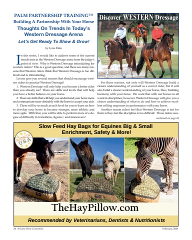In this series, I would like to address some of the currenttrends seen in the Western Dressage arena from the judge’spoint of view. Why is Western Dressage intimidating forwestern riders? This is a good question, and there are many reasons that Western riders think that Western Dressage is too difficult and is intimidating. Let me give you several reasons that should encourage western riders to practice Western Dressage!1. Western Dressage will only help you become a better riderthan you already are! There are skills and levels that will helpyou have a better balance on your horse.2. There are skills that will help you understand your horse moreand communicate more desirably with the horse to accept your aids.3. There will be so much at each level for you to learn on howto develop your horse to become stronger, more athletic andmore agile. With that, you will be able to perform more of a degree of difficulty in transitions, figures\\ and maneuvers!For these reasons, not only will Western Dressage build aclearer understanding of yourself as a correct rider, but it willalso build a clearer understanding of your horse, thus, buildingharmony with your horse. We want that with our horses in allwestern disciplines; however, Western Dressage will give you aclearer understanding of what to do and how to achieve excellent willing responses in performance with your horse. Another reason riders feel that Western Dressage is not forthem is they feel the discipline is too difficult. Those riders usuPALM PARTNERSHIP TRAINING™Building A Partnership With Your HorseThoughts On Trends In Today’sWestern Dressage ArenaLet’s Get Ready To Show & Grow!by Lynn Palm24 Arizona Horse Connection February, 2026continued on page 26%u0019 %u0019 %u0019 %u0019 %u0019 %u0019 %u0019%u0019 %u0019%u0019 %u0019%u0019%u000e %u000e %u000e %u000e%u000e\t%u000e%u0006fflffifl%u001a%u0019 %u0019 %u0019 %u0019 %u0019 %u0019 %u0019%u0019 %u0019 %u0018%u0017%u0017%u0016 %u0015%u0014%u0019 %u0019%u0019%u000e %u000e %u000e %u000e%u000e%u0006%u0005%u0007%u0017\t%u0004%u0003 ffl%u0014%u000f%u0017%u0004%u0013 \b fl%u000e%u0017%u0001%u0019 %u0019 %u0019 %u0019 %u0019 %u0019 %u0019%u0019 %u0019 %u0014%u0013 %u0012%u0014%u0011%u0010 %u000ffl%u000e \f%u000b\t%u0017%u0010 %u0012%u0011%u0019 %u0019%u0019%u000e %u000e %u000e %u000e%u000e%u0019 %u0019 %u0019 %u0019 %u0019 %u0019 %u0019%u0019 %u0019 \b ffl%u0007%u0014ffiffi%u0019 %u0019%u0019%u000e %u000e %u000e %u000e%u000e%u000b\t\b%u0007%u0006%u0006%u0005%u0004%u0003%u0005%u0001%u0019 %u0019 %u0019 %u0019 %u0019 %u0019 %u0019%u0019 %u0019%u0019 %u0019%u0019%u000e %u000e %u000e %u000e%u000e%u000e\f%u0019 %u0019 %u0019 %u0019 %u0019 %u0019 %u0019%u0019 %u0019%u0019 %u0019%u0019%u000e %u000e %u000e %u000e%u000e %u0003 %u0001\t\b\b%u0012%u0010\b%u0006%u0006%u0001%u0019 %u0019 %u0019 %u0019 %u0019 %u0019 %u0019%u0019 %u0019%u0019 %u0019%u0019%u0015%u0014%u0013%u0012%u0011%u0011%u0014%u0010%u000f%u0014%u000f%u000e %u000e %u000e %u000e%u000e \f %u000b%u0014%u0014\t\b%u0010%u0007\t\b%u0007%u0010%u0006%u0005 %u0004%u0014%u0010\b%u0006%u0006 %u0003\f%u000b\t\b%u0007%u0006%u0006%u0005%u0004%u0003%u0005%u0001%u000e