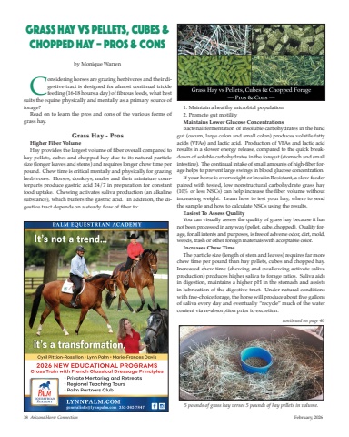 Considering horses are grazing herbivores and their digestive tract is designed for almost continual tricklefeeding (16-18 hours a day) of fibrous feeds, what bestsuits the equine physically and mentally as a primary source offorage? Read on to learn the pros and cons of the various forms ofgrass hay.Grass Hay - ProsHigher Fiber VolumeHay provides the largest volume of fiber overall compared tohay pellets, cubes and chopped hay due to its natural particlesize (longer leaves and stems) and requires longer chew time perpound. Chew time is critical mentally and physically for grazingherbivores. Horses, donkeys, mules and their miniature counterparts produce gastric acid 24/7 in preparation for constantfood uptake. Chewing activates saliva production (an alkalinesubstance), which buffers the gastric acid. In addition, the digestive tract depends on a steady flow of fiber to:1. Maintain a healthy microbial population2. Promote gut motility Maintains Lower Glucose ConcentrationsBacterial fermentation of insoluble carbohydrates in the hindgut (cecum, large colon and small colon) produces volatile fattyacids (VFAs) and lactic acid. Production of VFAs and lactic acidresults in a slower energy release, compared to the quick breakdown of soluble carbohydrates in the foregut (stomach and smallintestine). The continual intake of small amounts of high-fiber forage helps to prevent large swings in blood glucose concentration.If your horse is overweight or Insulin Resistant, a slow feederpaired with tested, low nonstructural carbohydrate grass hay(10% or less NSCs) can help increase the fiber volume withoutincreasing weight. Learn how to test your hay, where to sendthe sample and how to calculate NSCs using the results. Easiest To Assess QualityYou can visually assess the quality of grass hay because it hasnot been processed in any way (pellet, cube, chopped). Quality forage, for all intents and purposes, is free of adverse odor, dirt, mold,weeds, trash or other foreign materials with acceptable color.Increases Chew TimeThe particle size (length of stem and leaves) requires far morechew time per pound than hay pellets, cubes and chopped hay.Increased chew time (chewing and swallowing activate salivaproduction) produces higher saliva to forage ratios. Saliva aidsin digestion, maintains a higher pH in the stomach and assistsin lubrication of the digestive tract. Under natural conditionswith free-choice forage, the horse will produce about five gallonsof saliva every day and eventually “recycle” much of the watercontent via re-absorption prior to excretion.Grass Hay vs Pellets, Cubes &Chopped Hay – Pros & Consby Monique Warren38 Arizona Horse Connection February, 2026continued on page 405 pounds of grass hay verses 5 pounds of hay pellets in volume.
