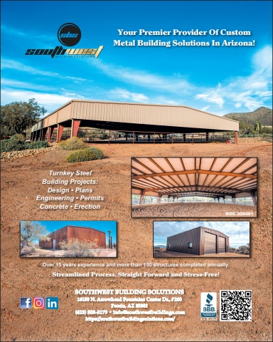Your Premier Provider Of Custom Metal Building Solutions In Arizona!SOUTHWEST BUILDING SOLUTIONS16150 N. Arrowhead Fountains Center Dr., #260 Peoria, AZ 85382(623) 505-3179 • info@southwestbuildings.comhttps://southwestbuildingsolutions.com/ROC 330481A+ RatedOver 15 years experience and more than 150 structures completed annually.Streamlined Process, Straight Forward and Stress-Free!Turnkey Steel Building Projects:Design • PlansEngineering • PermitsConcrete • Erection