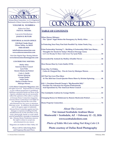 4 Arizona Horse Connection February, 2026Arizona Horse Connection® is a u.s. registeredtrademark of Horse Connection Magazines, LLCVoLuMe 39, nuMber 4Editor-In-ChiefPAtti e. truebALayout & DistributionJAson r. butLereDitoriAL & sALes oFFiCe1130 red Cinder roadChino Valley, Az 86323(928) 636-8651info@azhorseconnection.comwww.azhorseconnection.comtAbLe oF ContentsWhen Horses Whisper: the “Quiet” signs before the emergency by shelly Allen . . . . . . . . . . . . . . . . 14is Protecting Your Pony Post sale Possible? by Adam trenk, esq.. . . . . . . . . . . 18Palm Partnership training™... building A Partnership With Your Horse...thoughts on trends in today’s Western Dressage ArenaLet’s Get Ready To Show And Grow! by Lynn Palm . . . . . . . . . . . . . . . . . . . . . . 24surrounded by Animals by shelley (Chaille) trevor . . . . . . . . . . . . . . . . . . . . . . 28How Horses Hear by Carin smith, DVM. . . . . . . . . . . . . . . . . . . . . . . . . . . . . . . . . 32grass Hay Vs Pellets, Cubes & Chopped Hay - Pros & Cons by Monique Warren . . . . . . . . . . . . . . . 38All that You Love Plus More At the 2026 sun Circuit Quarter Horse show by Kristen spinning . . . . . . . . 48H.r. 1, President Donald trump’s “big beautiful bill,” Provides tax Advances For equine Professionals And operations by the American Horse Council . . . . . . . . . . . . . . . . . . . . . . . 54the godolphin Arabian by george stubbs . . . . . . . . . . . . . . . . . . . . . . . . . . . . . . 62Changing Horses in Midstream by bonnie Marlewski-Probert . . . . . . . . . . . . . 72Horse Property Connection. . . . . . . . . . . . . . . . . . . . . . . . . . . . . . . . . . . . . . . . . . . . . 74About The Cover:71st Annual scottsdale Arabian showWestworld • scottsdale, AZ • February 12 - 22, 2026www.scottsdaleshow.comPhoto of Eddie McCain riding Nat King Cole CAPhoto courtesy of Dallas reed PhotographyVisit Our Digital Page-Turning Website www.horseconnectionmagazine.comContributing Writers: shelly AllenAmerican Horse CouncilLynn Palmbonnie Marlewski-ProbertCarin A. smithKristen spinninggeorge stubbsAdam trenkshelley (Chaille) trevorMonique Warren©2026 Horse Connection Magazines, LLC.All rights reserved. Reproduction in wholeor part without permission is prohibited.Opinions expressed herein are those of theexperts consulted and do not necessarily reflect the opinions of the editor or policy of Arizona Horse Connection magazine. Arizona Horse Connection is not liable forany damages beyond the cost of the advertisement for any error or omissionsthat may occur. In addition, the advertiserand/or its agency agree to indemnify Arizona Horse Connection against any loss,damages or expenses resulting from the unauthorized use, by the advertiser, of anyname, photograph, sketch or words whichmay be protected by copyright or trademarklaw. Arizona Horse Connection reserves the right to refuse to accept any advertisement for any reason.Magazines are mailed at Chino Valley, AZ.Please Call For Advertising Ratesand Frequency Discount Prices.