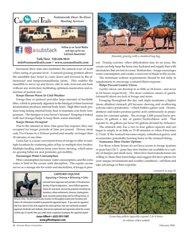 Increased chew time also facilitates the natural wear of teethwhen eating at ground level. A natural grazing position allowsthe mandible (jaw bone) to come down and forward in the atlantoaxial and temporomandibular joints. This enables themandible to move up and down, side to side, forward and backwithout any restriction; facilitating optimum mastication and reduction of particle size.Keeps Horses Warm In Cold WeatherForage (hay or pasture) provides large amounts of insolublefiber, which is primarily digested in the hindgut (where bacterialfermentation produces internal body heat). High fiber feeds produce long lasting internal body heat to maintain core body temperature. The hindgut is your horse’s furnace! Keeping it stokedwith fuel (forage) helps to keep them warm internally.Keeps Horses OccupiedDue to the amount of chew time grass hay requires, they stayoccupied for longer periods of time per pound. Horses sleeponly 3 to 4 hours in a 24-hour period and usually no longer than20 minutes at one time.Grass hay is a more convenient form of forage to offer in multiple locations by scattering piles of hay or multiple slow feeders.Multiple feeding stations keep your horse moving, which mimics grazing behavior and promotes gut motility. Encourages Water ConsumptionFiber consumption increases water consumption, and the extrawater is held in the cecum until absorption. The equine cecumserves as a storage site for water and electrolytes, if forage is present. During exercise, when dehydration may be an issue, thececum can help keep the horse stay hydrated and supply him withelectrolytes that are lost in sweat. Bottom line - forage encourageswater consumption and creates a reservoir of fluids in the cecum.The minimum sodium requirements should be fed daily insupplements to encourage a natural thirst response.Helps Prevent Gastric UlcersGastric ulcers can develop in as little as 24 hours - and recurin 24 hours respectively. The most common causes of gastric(stomach) ulcers are lack of forage and stress.Foraging throughout the day and night maintains a higher(more alkaline) stomach pH because chewing and swallowingactivate saliva production – which buffers gastric acid. Horses,donkeys and mules produce gastric acid continuously in preparation for constant uptake. The average 1,000 pound horse produces 16 gallons a day of gastric/hydrochloric acid. Thatequates to .66 gallons per hour (16 gallons divided by 24 hours).The stomach only has a two to four gallon capacity and canbegin to empty in as little as 15-20 minutes or when it becomes2/3 full. If the stomach becomes empty, unbuffered gastric acidaccumulates potentially burning holes in the stomach lining.Numerous Slow Feeder OptionsFor those whose horses do not have access to forage (pastureor grass hay) 24/7, grass hay slow feeders are available in a variety of designs and mesh sizes. Most slow feed manufacturers arewilling to share their knowledge and suggest the best options foryour unique environment and weather conditions - call them andtake advantage of their expertise.40 Arizona Horse Connection February, 2026Grass hay pellets typically expand 2 to 4 timesin volume when soaked.Simulate grazing with a standard hay bag.continued on page 42Nationwide Door-To-DoorHauling ServicesTalk/Text:520-604-9813info@carouseltrails.com • www.carouseltrails.comFollow us on Social Mediaand sign up for our SubStack Newsletter!GIFFORD EQUINEAppraising • Training • Rehoming • SalesLicensed horse appraiser and member of the AmericanSociety of Equine Appraisers. Jason Gifford appraiseshorses for insurance, various tax purposes including taxdonations, estate settlements, divorces, bankruptcies,loans, business partnerships and for selling horses, tolist just a few. He will travel to your location to thoroughly inspect your horses(s) and obtain all information needed to prepare the appraisal report. If you want an appraisalthat has a basis of fact, that supports the value opinion, that uses nationally accepted appraisal standards and methods, that can be explained and represents what the currentmarket says it’s worth, then you need Jason’s expertise to prepare the appraisal report!Jason Gifford • (623) 293-7487www.giffordequine.com
