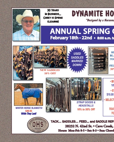 28232 N. 42nd St. • Cave Creek, Hours: Mon-Fri: 8-5 • Sat: 8-3 • Sun: ClosedTACK… SADDLES… FEED... and SADDLE REPANEW SADDLES10% OFFANNUAL SPRING CFebruary 18th - 22nd • 8:00 a.m. to• BIT10%• ST$10.00 • SELECTTOO TOWINTER HORSE BLANKETS!$89.95 While They Last!30 Years In Business...Corky is Springcleaning! SEBLATOPFEL50%DYNAMITE HO“Designed by a HorsemaSTRAP GOODS & HEADSTALLS10% to 50% Off!USED SADDLESMARKEDDOWN!