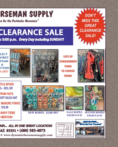 AZ 85331 • (480) 585-4073d • www.dynamitehorsemansupply.comAIR... ALL IN ONE GREAT LOCATION!RAIN OR SHINE...We’ve Got You “Covered”CLEARANCE SALEo 5:00 p.m. Every Day Including SUNDAY!TS & SPURS% - 50% OffTRAW HATS OFF EACH HATT MANURE FORKS$18.00 MANY ITEMS O MENTION!ELECTANKET P PADS & LT PADS% OFFDON’T MISS THISGREAT CLEARANCESALE!ORSEMAN SUPPLYan for the Particular Horseman”LOTS OFCONSIGNMENTITEMSTO CHOOSEFROM!NEW ROPES - $2.00 OFF SALE ROPES$20.00 EACHSECOND ROPES$30.00 EACH