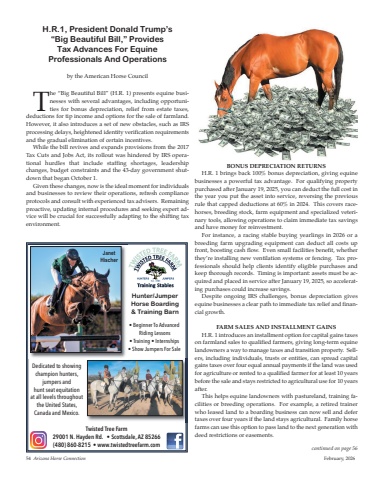 The “Big Beautiful Bill” (H.R. 1) presents equine businesses with several advantages, including opportunities for bonus depreciation, relief from estate taxes,deductions for tip income and options for the sale of farmland.However, it also introduces a set of new obstacles, such as IRSprocessing delays, heightened identity verification requirementsand the gradual elimination of certain incentives.While the bill revives and expands provisions from the 2017Tax Cuts and Jobs Act, its rollout was hindered by IRS operational hurdles that include staffing shortages, leadershipchanges, budget constraints and the 43-day government shutdown that began October 1.Given these changes, now is the ideal moment for individualsand businesses to review their operations, refresh complianceprotocols and consult with experienced tax advisers. Remainingproactive, updating internal procedures and seeking expert advice will be crucial for successfully adapting to the shifting taxenvironment.Bonus Depreciation returnsH.R. 1 brings back 100% bonus depreciation, giving equinebusinesses a powerful tax advantage. For qualifying propertypurchased after January 19, 2025, you can deduct the full cost inthe year you put the asset into service, reversing the previousrule that capped deductions at 60% in 2024. This covers racehorses, breeding stock, farm equipment and specialized veterinary tools, allowing operations to claim immediate tax savingsand have money for reinvestment.For instance, a racing stable buying yearlings in 2026 or abreeding farm upgrading equipment can deduct all costs upfront, boosting cash flow. Even small facilities benefit, whetherthey’re installing new ventilation systems or fencing. Tax professionals should help clients identify eligible purchases andkeep thorough records. Timing is important: assets must be acquired and placed in service after January 19, 2025, so accelerating purchases could increase savings.Despite ongoing IRS challenges, bonus depreciation givesequine businesses a clear path to immediate tax relief and financial growth.Farm sales anD installment Gains H.R. 1 introduces an installment option for capital gains taxeson farmland sales to qualified farmers, giving long-term equinelandowners a way to manage taxes and transition property. Sellers, including individuals, trusts or entities, can spread capitalgains taxes over four equal annual payments if the land was usedfor agriculture or rented to a qualified farmer for at least 10 yearsbefore the sale and stays restricted to agricultural use for 10 yearsafter.This helps equine landowners with pastureland, training facilities or breeding operations. For example, a retired trainerwho leased land to a boarding business can now sell and defertaxes over four years if the land stays agricultural. Family horsefarms can use this option to pass land to the next generation withdeed restrictions or easements.H.R.1, President Donald Trump’s “Big Beautiful Bill,” Provides Tax Advances For Equine Professionals And Operationsby the American Horse Council54 Arizona Horse Connection February, 2026Twisted Tree Farm29001 N. Hayden Rd. • Scottsdale, AZ 85266(480) 860-8215 • www.twistedtreefarm.comHunter/Jumper Horse Boarding & Training Barn• Beginner To AdvancedRiding Lessons• Training • Internships• Show Jumpers For SaleDedicated to showingchampion hunters,jumpers and hunt seat equitation at all levels throughoutthe United States,Canada and Mexico. Janet Hischercontinued on page 56