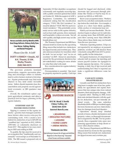 The provision promotes farmlandpreservation, supports succession planning and encourages sellers to transferland to active farmers instead of developers. Equine professionals may find morechances to buy land under favorableterms. Sellers should maintain clear documentation and properly record agricultural covenants, as IRS guidance mayevolve.Overall, the installment option supports agricultural continuity and offers apractical tool for legacy planning in theequine industry.overtime anD tip income DeDuctions Tipping is common in the equine industry – grooms, barn managers and freelance farriers often receive extra pay foroutstanding work. H.R. 1 creates a newfederal tax deduction of up to $25,000 for“qualified tips” reported on W-2, 1099-K,1099-NEC or voluntarily disclosed onForm 4317. This applies to tax years starting in 2025 and ending in 2028.To qualify, the tips must be received inan occupation that “traditionally and customarily” received tips as of December 31,2024. The IRS issued a proposed rule onSeptember 22 that identifies occupationscustomarily and regularly receiving tips,with a public comment period that endedon October 22. With the support of AHC’sRegulatory Committee, we submittedcomments asking that the classificationcategory “TTOC 506: Pet Caretakers” instead be labeled “TTOC 506: Pet and Livestock Caretakers.” This potentially coversmany service roles in the equine industry,such as barn staff, grooms, show assistantsand hospitality workers at events. Not allroles qualify, and high earners may see thebenefit phase out.The Treasury Department and IRS havereleased draft tax forms for the upcomingfiling season that include new deductionsfor tipped income and overtime pay. Theyalso announced plans for transition relieffor both “no tax on tips” and “no tax onovertime” in 2025. However, uncertaintycaused by the government shutdown hasleft stakeholders waiting for more detailson what that relief will entail.Key considerations for equine industryprofessionals:Documentation is essential. Tips mustbe properly reported to qualify. Cash tipsshould be logged and disclosed, whileelectronic tips processed through platforms like Venmo or PayPal may be reported via 1099-K or 1099-NEC.Know your occupation status. Workersmust be in a role that customarily receivedtips before the cutoff date. For example, agroom at a show barn likely qualifies,while a jockey or veterinarian may not.Watch your income thresholds. The deduction begins to phase out for individuals earning more than $150,000 and forjoint filers earning more than $300,000.Those above these limits may not benefitfrom the new provision.Voluntary reporting matters. If tips arenot reported by an employer or paymentplatform, workers can still disclose themvoluntarily using IRS Form 4317 to potentially qualify for the deduction.For equine businesses, it’s important toeducate staff on proper tip reporting andensure payroll systems are equipped tohandle separate tip entries. For workers,keeping a daily log of tips received andunderstanding how they’re reported canmake a significant difference come taxtime.casualty losses, Disaster relieF Casualty and theft loss deductions havelong been a complex area of tax law, particularly for agricultural and equine businesses that face unique risks from naturaldisasters, theft and property damage. H.R.1 expands relief. Starting in 2026, lossesfrom state-declared disasters will also qualify for deductions, not just federally declared events. The same reductionthresholds ($100 or $500 per incident) apply,but more businesses can now claim deductions for damages from local disasters.Operations should keep detailedrecords of losses, disaster declarations andproperty values, as thorough documentation is required by the IRS. For tax professionals, these expanded rules open newplanning opportunities to help clients recover when disaster strikes.The Treasury Department and IRS havereleased draft tax forms for the upcomingfiling season that include new deductionsfor tipped income and overtime pay.56 Arizona Horse Connection February, 2026Horses available sired by Metallics MVP, Dont Stopp Believin, Hickory Holly Time.Cow Horse, Cutting, Ropingand Barrel ProspectsPlease Give Us A Call!DUSTY A RANCH • Amado, AZB.K. Thwaits, D.V.M. Shelby Thwaits (520) 940-3573SANTORI RANCH• BOARDING • IRRIGATED PASTURES• LESSONS • HORSE CAMPS• ARENA RENTALTrainers on SiteSpecializing in lessons for all ages and abilities.Beginner to the show ring! Seasonedschool horses and leases available.955 W. Road 2 North Chino Valley, AZ(928) 848-3659 Santori-Ranch.comcontinued on page 58