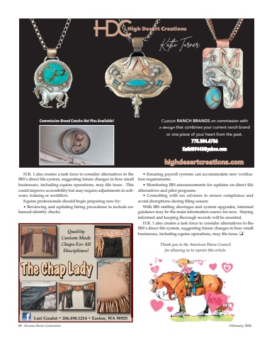 H.R. 1 also creates a task force to consider alternatives to theIRS’s direct file system, suggesting future changes in how smallbusinesses, including equine operations, may file taxes. Thiscould improve accessibility but may require adjustments in software, training or workflow.Equine professionals should begin preparing now by:• Reviewing and updating hiring procedures to include enhanced identity checks.• Ensuring payroll systems can accommodate new verification requirements.• Monitoring IRS announcements for updates on direct filealternatives and pilot programs.• Consulting with tax advisors to ensure compliance andavoid disruptions during filing season.With IRS staffing shortages and system upgrades, informalguidance may be the main information source for now. Stayinginformed and keeping thorough records will be essential.H.R. 1 also creates a task force to consider alternatives to theIRS’s direct file system, suggesting future changes in how smallbusinesses, including equine operations, may file taxes. oThank you to the American Horse Council for allowing us to reprint this article.60 Arizona Horse Connection February, 2026Kathi Turnerhighdesertcreations.comCustom RANCH BRANDS on commission witha design that combines your current ranch brand or one piece of your heart from the past.775.304.6756Kathi89445@yahoo.comHigh Desert CreationsCommission Brand Concho Hat Pins Available!Quality Custom MadeChaps For AllDisciplines!lori Goulet • 206.498.1214 • easton, Wa 98925