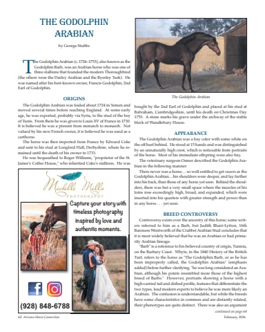The Godolphin Arabianby George StubbsThe Godolphin Arabian (c.1724–1753), also known as theGodolphin Barb, was an Arabian horse who was one ofthree stallions that founded the modern Thoroughbred(the others were the Darley Arabian and the Byerley Turk). Hewas named after his best-known owner, Francis Godolphin, 2ndEarl of Godolphin.ORIGINSThe Godolphin Arabian was foaled about 1724 in Yemen andmoved several times before reaching England. At some earlyage, he was exported, probably via Syria, to the stud of the beyof Tunis. From there he was given to Louis XV of France in 1730.It is believed he was a present from monarch to monarch. Notvalued by his new French owner, it is believed he was used as acarthorse.The horse was then imported from France by Edward Cokeand sent to his stud at Longford Hall, Derbyshire, where he remained until the death of his owner in 1733.He was bequeathed to Roger Williams, \James's Coffee House,\bought by the 2nd Earl of Godolphin and placed at his stud atBabraham, Cambridgeshire, until his death on Christmas Day1753. A stone marks his grave under the archway of the stableblock of Wandlebury House.APPEARANCEThe Godolphin Arabian was a bay color with some white onthe off heel behind. He stood at 15 hands and was distinguishedby an unnaturally high crest, which is noticeable from portraitsof the horse. Most of his immediate offspring were also bay.The veterinary surgeon Osmer described the Godolphin Arabian in the following manner:There never was a horse… so well entitled to get racers as theGodolphin Arabian…his shoulders were deeper, and lay fartherinto his back, than those of any horse yet seen. Behind the shoulders, there was but a very small space where the muscles of hisloins rose exceedingly high, broad, and expanded, which wereinserted into his quarters with greater strength and power thanin any horse . . . yet seen.BREED CONTROVERSYControversy exists over the ancestry of this horse; some writers referred to him as a Barb, but Judith Blunt-Lytton, 16thBaroness Wentworth of the Crabbet Arabian Stud concludes thatit is most widely believed that he was an Arabian or had primarily Arabian lineage.\on the Barbary Coast. Whyte, in the 1840 History of the BritishTurf, refers to the horse as \been improperly called, the Godolphin Arabian\added) before further clarifying, \bian, although his points resembled more those of the highestbreed of Barbs.\high-carried tail and dished profile, features that differentiate thetwo types, lead modern experts to believe he was more likely anArabian. The confusion is understandable, but while the breedshave some characteristics in common and are distantly related,their phenotypes are quite distinct. There was also an argumentThe Godolphin Arabian62 Arizona Horse Connection February, 2026continued on page 64(928) 848-6788 Capture your story with timeless photographyinspired by love and authentic moments.
