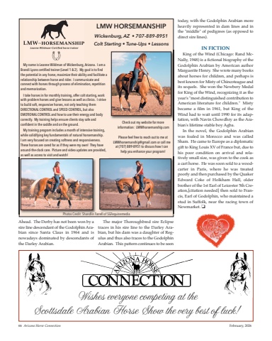 Ahead. The Derby has not been won by asire line descendant of the Godolphin Arabian since Santa Claus in 1964 and isnowadays dominated by descendants ofthe Darley Arabian.The major Thoroughbred sire Eclipsetraces in his sire line to the Darley Arabian, but his dam was a daughter of Regulus and thus also traces to the GodolphinArabian. This pattern continues to be seentoday, with the Godolphin Arabian moreheavily represented in dam lines and inthe \direct sire lines).IN FICTIONKing of the Wind (Chicago: Rand McNally, 1948) is a fictional biography of theGodolphin Arabian by American authorMarguerite Henry. She wrote many booksabout horses for children, and perhaps isbest known for Misty of Chincoteague andits sequels. She won the Newbery Medalfor King of the Wind, recognizing it as theyear's \American literature for children.\became a film in 1961, but King of theWind had to wait until 1990 for its adaptation, with Navin Chowdhry as the Arabian's lifetime stable boy Agba.In the novel, the Godolphin Arabianwas foaled in Morocco and was calledSham. He came to Europe as a diplomaticgift to King Louis XV of France but, due tohis poor condition on arrival and relatively small size, was given to the cook asa cart horse. He was soon sold to a woodcarter in Paris, where he was treatedpoorly and then purchased by the QuakerEdward Coke of Holkham Hall, olderbrother of the 1st Earl of Leicester 5th Creation,[citation needed] then sold to Francis, Earl of Godolphin, who maintained astud in Suffolk, near the racing town ofNewmarket. o66 Arizona Horse Connection February, 2026LMW HORSEMANSHIPWickenburg, AZ • 707-889-8951Colt Starting • Tune-Ups • LessonsMy name is Leanne Wildman of Wickenburg, Arizona. I am aBrandi Lyons certified trainer (Level 1 & 2). My goal is to find the potential in any horse, maximize their ability and facilitate a relationship between horse and rider. I communicate and connect with horses through process of elimination, repetitionand memorization. I take horses in for monthly training, offer colt starting, workwith problem horses and give lessons as well as clinics. I striveto build soft, responsive horses, not only teaching them DIRECTIONAL CONTROL and SPEED CONTROL, but alsoEMOTIONAL CONTROL and how to use their energy and body correctly. My training helps ensure clients stay safe andconfident in the saddle and on the ground.My training program includes a month of intensive training,while solidifying key fundamentals of natural horsemanship. I am very focused on creating softness and responsiveness.These horses are cared for as if they were my own! They havearound-the-clock care. Picture and video updates are provided,as well as access to visit and watch!Check out my website for moreinformation: LMWhorsemanship.comPlease feel free to reach out to me atLMWhorsemanship@gmail.com or call meat (707) 889-8951 to discuss how I can help you enhance your program!Photos Credit: Shandlin Farrell of SGFequinemediaWishes everyone competing at the Scottsdale Arabian Horse Show the very best of luck!