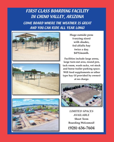 FIRST CLASS BOARDING FACILITY IN CHINO VALLEY, ARIZONACOME BOARD WHERE THE WEATHER IS GREATAND YOU CAN RIDE ALL YEAR LONG!Huge outside pens (varying sizes)with shades, fed alfalfa hay twice a day. $475/month.Facilities include large arena, large turn-out area, round pen, tack room, wash racks, vet stock and horse trailer parking space. Will feed supplements or othertype hay (if provided by owner) at no charge. LIMITED SPACES AVAILABLEShort Term Boarding Welcomed!(928) 636-7604