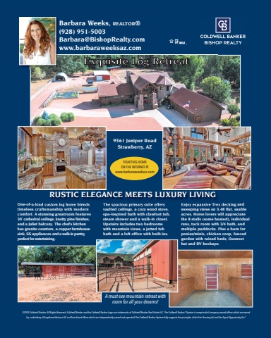 Barbara Weeks, REALTOR®(928) 951-5003Barbara@BishopRealty.comwww.barbaraweeksaz.comOne-of-a-kind custom log home blendstimeless craftsmanship with moderncomfort. A stunning greatroom features30’ cathedral ceilings, knotty pine finishes,and a Juliet balcony. The chef’s kitchenhas granite counters, a copper farmhousesink, SS appliances and a walk-in pantry,perfect for entertaining.The spacious primary suite offersvaulted ceilings, a cozy wood stove,spa-inspired bath with clawfoot tub,steam shower and a walk-in closet.Upstairs includes two bedrooms with mountain views, a jetted tubbath and a loft office with built-ins.Enjoy expansive Trex decking andsweeping views on 3.48 flat, usableacres. Horse lovers will appreciatethe 8 stalls (some heated), individualruns, tack room with 3/4 bath, andmultiple paddocks. Plus a barn forponies/minis, chicken coop, fencedgarden with raised beds, Quonset hut and RV hookups.9361 Juniper RoadStrawberry, AZA must-see mountain retreat withroom for all your dreams!Exquisite Log RetreatRUSTIC ELEGANCE MEETS LUXURY LIVING©2025 Coldwell Banker. All Rights Reserved. Coldwell Banker and the Coldwell Banker logos are trademarks of Coldwell Banker Real Estate LLC. The Coldwell Banker® System is comprised of company owned offices which are owned by a subsidiary of Anywhere Advisors LLC and franchised offices which are independently owned and operated. The Coldwell Banker System fully supports the principles of the Fair Housing Act and the Equal Opportunity Act.\TOUR THIS HOMEON THE INTERNET ATwww.barbaraweeksaz.com