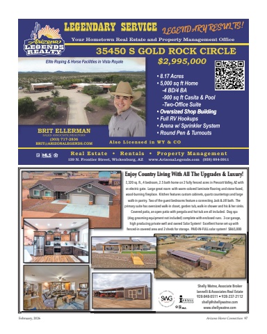 February, 2026 Arizona Horse Connection 972,320 sq. ft., 4 bedroom, 2.5 bath home on 2 fully fenced acres in Prescott Valley, AZ withan electric gate. Large great room with warm-colored laminate flooring and stone faced,wood-burning fireplace. Kitchen features custom cabinets, quartz countertops and largewalk-in pantry. Two of the guest bedrooms feature a connecting Jack & Jill bath. The primary suite has oversized walk-in closet, garden tub, walk-in shower and his & her sinks.Covered patio, an open patio with pergola and hot tub are all included. Dog spa (dog grooming equipment not included) complete with enclosed runs. 3-car garage,high producing private well and owned Solar System! Excellent horse set-up with fenced-in covered area and 2 sheds for storage. PAID-IN-FULL solar system! $865,000Shelly Watne, Associate BrokerIannelli & Associates Real Estate928-848-0511 • 928-237-2112 shelly@shellywatne.com www.shellywatne.com Enjoy Country Living With All The Upgrades & Luxury!