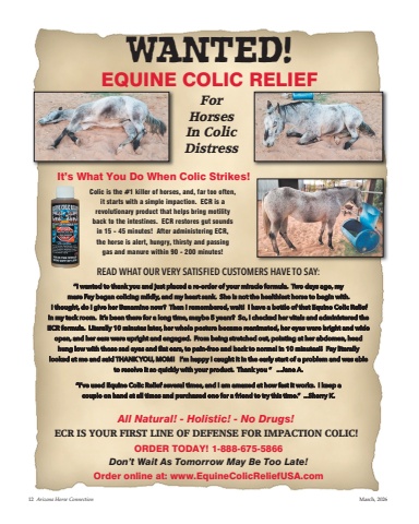 WANTED!EQUINE COLIC RELIEFColic is the #1 killer of horses, and, far too often,it starts with a simple impaction. ECR is a revolutionary product that helps bring motility back to the intestines. ECR restores gut sounds in 15 - 45 minutes! After administering ECR, the horse is alert, hungry, thirsty and passing gas and manure within 90 - 200 minutes!ORDER TODAY! 1-888-675-5866Don%u2019t Wait As Tomorrow May Be Too Late!Order online at: www.EquineColicReliefUSA.comAll Natural! - Holistic! - No Drugs!ECR IS YOUR FIRST LINE OF DEFENSE FOR IMPACTION COLIC!For Horses In Colic DistressIt%u2019s What You Do When Colic Strikes!12 Arizona Horse Connection March, 2026READ WHAT OUR VERY SATISFIED CUSTOMERS HAVE TO SAY:%u201cI wanted to thank you and just placed a re-order of your miracle formula. Two days ago, my mare Fay began colicing mildly, and my heart sank. She is not the healthiest horse to begin with. I thought, do I give her Banamine now? Then I remembered, wait! I have a bottle of that Equine Colic Reliefin my tack room. It%u2019s been there for a long time, maybe 5 years? So, I checked her vitals and administered theECR formula. Literally 10 minutes later, her whole posture became reanimated, her eyes were bright and wideopen, and her ears were upright and engaged. From being stretched out, pointing at her abdomen, headhung low with those sad eyes and flat ears, to pain-free and back to normal in 10 minutes!! Fay literallylooked at me and said THANK YOU, MOM! I%u2019m happy I caught it in the early start of a problem and was ableto resolve it so quickly with your product. Thank you %u201c ...Jane A.%u201cI%u2019ve used Equine Colic Relief several times, and I am amazed at how fast it works. I keep a couple on hand at all times and purchased one for a friend to try this time.%u201d ...Sherry K.