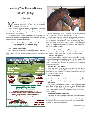 Most horse owners can recognize a problem when it%u2019sobvious. The limp. The cut. The colic signs thatstop you in your tracks.What%u2019s harder to recognize are the quiet changes that comebefore an emergency. Those subtle shifts in behavior, movementor routine that only stand out if you already know what %u201cnormal%u201d looks like for your horse.Late winter is one of the best times to learn your horse%u2019s normal, before spring grass, increased riding schedules and seasonaltransitions begin to change the picture.This Isn%u2019t About Becoming Obsessive Or Hyper-Vigilant. It%u2019s About Clarity.Why %u201cNormal%u201d Is IndividualThere is no single definition of normal that applies to everyhorse. Some horses are naturally quiet and economical with energy. Others are alert, animated and expressive. One horsedrinks aggressively and leaves a wet stall. Another sips throughout the day. All of these can be completely normal.Trouble starts when we rely on averages instead of patterns.A heart rate that falls within a published %u201cnormal%u201d range maystill be abnormal for a particular horse. A small change in manure consistency might mean nothing for one horse and signaltrouble for another. Context matters. Knowing your horse%u2019s normal gives you that context.Start With Everyday ObservationYou don%u2019t need special tools or spreadsheets to build a baseline.You just need to pay attention to a few key areas consistently.Demeanor And behaviorNotice how your horse typically greets you. Are they curious,reserved, food-focused or indifferent? How do they stand in thestall or pasture? How quickly do they settle after turnout orwork? These patterns are often the first things to shift whensomething isn%u2019t right.Appetite And Water IntakeDoes your horse clean up hay immediately or eat slowlythroughout the day? Do they drink heavily overnight or steadilyacross hours? You don%u2019t need exact measurements, but changesin routine are worth noting.Manure And UrineFrequency, consistency and appearance matter more than perfection. When you know what%u2019s normal for your horse, subtlechanges become easier to recognize early.MovementWatch your horse walk regularly, not just under saddle. Observe them moving freely in turnout or down the barn aisle.Look for symmetry, stride length and willingness to move forward. Mild stiffness often shows up here before workload increases in spring.Establishing Baseline Vital SignsVital signs are often treated as emergency-only information,but they%u2019re far more useful when you know what%u2019s normal before an emergency occurs. Late winter is an ideal time to gatherbaseline readings because horses are generally at rest and not influenced by heat or heavy exercise.Learning Your Horse%u2019s Normal Before Spring!by Shelly Allencontinued on page 1614 Arizona Horse Connection March, 2026Jean Burke Tubac, Arizona(520) 401-2233%u2022 24 Hour On-Site Supervision%u2022 Veterinarian On CallSpecialized horse care...over 20 years of quality service.Psalm 40Lush Green Grass Pastures... Lush Green Grass Pastures...in Southern Arizona in Southern Arizona%u2022 Mares %u2022 Geldings%u2022 Weanlings%u2022 Mares And Foals%u2022 Lay Ups%u2022 Retired Horses%u2022 35 Years In Business%u2022 Year RoundElevation 3300 ft.Does your horse need a new lease on life? Do you want your youngsters to grow up as real horses? Do you like green grass and cooler weather? Then these pastures are for you!100 Irrigated Acres Divided Into 5 to 6 Acre Pastureswith Smooth Wire & Pipe FencingElectric Fence %u2022 Pens Available