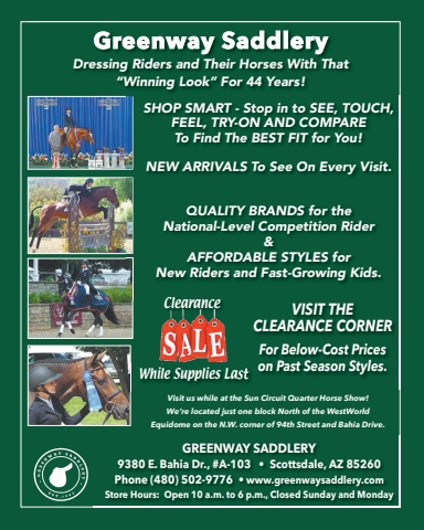 Greenway SaddleryDressing Riders and Their Horses With That %u201cWinning Look%u201d For 44 Years!SHOP SMART - Stop in to SEE, TOUCH,FEEL, TRY-ON AND COMPARE To Find The BEST FIT for You!NEW ARRIVALS To See On Every Visit.QUALITY BRANDS for theNational-Level Competition Rider&AFFORDABLE STYLES for New Riders and Fast-Growing Kids.ClearanceWhile Supplies LastVISIT THE CLEARANCE CORNERFor Below-Cost Prices on Past Season Styles.Visit us while at the Sun Circuit Quarter Horse Show!We%u2019re located just one block North of the WestWorld Equidome on the N.W. corner of 94th Street and Bahia Drive.GREENWAY SADDLERY9380 E. Bahia Dr., #A-103 %u2022 Scottsdale, AZ 85260 Phone (480) 502-9776 %u2022 www.greenwaysaddlery.comStore Hours: Open 10 a.m. to 6 p.m., Closed Sunday and Monday