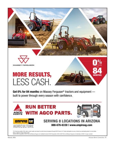 0 MORE RESULTS,LESS CASH.Get 0% for 84 months on Massey Fergusobuilt to power through every season with co MON08Fon%u00ae tractors and equipment %u2014 onfidence. * NTHS0FINANCING84FOR *0% financing available. Offer valid on select models and subject to credit review and approval through AGCO Finance LLC. Dealer participation may vary. ContactOffer is subject to change without notice.%u00a92025 AGCO Corporation. AGCO Parts and Massey Ferguson are worldwide brands of AGCO Corporation. AGCO, AGCO Parts and Massey Ferguson are tradema888-676-6330 | www.emSERVING 8 LOCATIONSgRUN BETTERWITH AGCO PARTS. t your participating dealer for more details.mpireag.comS IN ARIZONA arks of AGCO. All rights reserved.March, 2026 Arizona Horse Connection 23