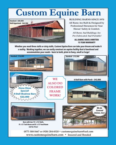 (877) 300-5667 or (928) 284-8320 %u2022 customequinebarn@aol.comwww.customequinebarn.com %u2022 Insured and BondedBUILDING BARNS SINCE 1970All Barns Are Built & Designed by Professional Horsemen for Your Horses%u2019 Safety & Comfort.All Barns And Buildings ArePre-Fabricated And Portable!ALL BARNS HAVE A WRITTEN15 YEAR WARRANTYWhether you need three stalls or sixty stalls, Custom Equine Barn can take your dream and make it a reality. Working together, we can easily construct an equine facility that is functional and accommodates your needs - basic to bold, plain to fancy, small or large!Horse Show Special!4-Stall Shedrow Barn$22,000We doCovered Arenas, too!Standard - $60,500 Well Appointed - $65,900Standard - $12,000 Standard - $16,0006-Stall Barn with Porch - $42,000Barn with two 12%u2019 x 16%u2019 Stalls,8%u2019 x 12%u2019 Tack Room and 8%u2019 x 12%u2019 Feed Room Call for Price!WE ALSO DO COLORED FRAME WORK!