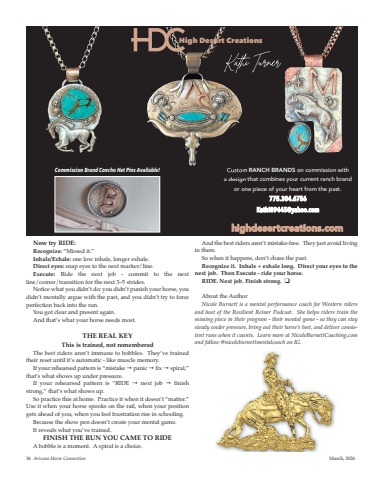 now try rIDe:recognize: %u201cMissed it.%u201dInhale/exhale: one low inhale, longer exhale.Direct eyes: snap eyes to the next marker/line.execute: Ride the next job - commit to the nextline/corner/transition for the next 3%u20135 strides.Notice what you didn%u2019t do: you didn%u2019t punish your horse, youdidn%u2019t mentally argue with the past, and you didn%u2019t try to forceperfection back into the run.You got clear and present again.And that%u2019s what your horse needs most.The real keYThis is trained, not rememberedThe best riders aren%u2019t immune to bobbles. They%u2019ve trainedtheir reset until it%u2019s automatic - like muscle memory.If your rehearsed pattern is %u201cmistake %u2192 panic %u2192 fix %u2192 spiral,%u201dthat%u2019s what shows up under pressure.If your rehearsed pattern is %u201cRIDE %u2192 next job %u2192 finishstrong,%u201d that%u2019s what shows up.So practice this at home. Practice it when it doesn%u2019t %u201cmatter.%u201dUse it when your horse spooks on the rail, when your positiongets ahead of you, when you feel frustration rise in schooling.Because the show pen doesn%u2019t create your mental game.It reveals what you%u2019ve trained.fInISh The rUn YoU caMe To rIDeA bobble is a moment. A spiral is a choice.And the best riders aren%u2019t mistake-free. They just avoid livingin them.So when it happens, don%u2019t chase the past.recognize it. Inhale + exhale long. Direct your eyes to thenext job. Then execute - ride your horse.rIDe. next job. finish strong. oAbout the AuthorNicole Burnett is a mental performance coach for Western ridersand host of the Resilient Reiner Podcast. She helps riders train themissing piece in their program - their mental game - so they can staysteady under pressure, bring out their horse%u2019s best, and deliver consistent runs when it counts. Learn more at NicoleBurnettCoaching.comand follow @nicoleburnettmentalcoach on IG.Kathi Turnerhighdesertcreations.comCustom RANCH BRANDS on commission witha design that combines your current ranch brand or one piece of your heart from the past.775.304.6756Kathi89445@yahoo.comHigh Desert CreationsCommission Brand Concho Hat Pins Available!36 Arizona Horse Connection March, 2026