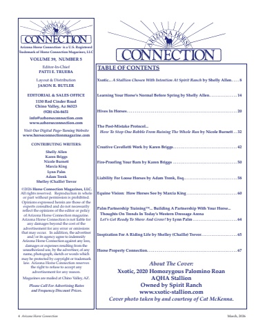 4 Arizona Horse Connection March, 2026Arizona Horse Connection%u00ae is a u.s. registeredtrademark of Horse Connection Magazines, LLCVoLuMe 39, nuMber 5Editor-In-ChiefPAtti e. truebALayout & DistributionJAson r. butLereDitoriAL & sALes oFFiCe1130 red Cinder roadChino Valley, Az 86323(928) 636-8651info@azhorseconnection.comwww.azhorseconnection.comtAbLe oF ContentsXxotic... A Stallion Chosen With Intention At Spirit Ranch by shelly Allen. . . . 8Learning Your Horse%u2019s normal before spring by shelly Allen. . . . . . . . . . . . . . 14Hives in Horses . . . . . . . . . . . . . . . . . . . . . . . . . . . . . . . . . . . . . . . . . . . . . . . . . . . . . . . 20the Post-Mistake Protocol... How To Stop One Bobble From Ruining The Whole Run by nicole burnett . . 32Creative Cavelletti Work by Karen briggs. . . . . . . . . . . . . . . . . . . . . . . . . . . . . . . . 42Fire-Proofing Your barn by Karen briggs . . . . . . . . . . . . . . . . . . . . . . . . . . . . . . . . 50Liability For Loose Horses by Adam trenk, esq. . . . . . . . . . . . . . . . . . . . . . . . . . . 58equine Vision: How Horses see by Marcia King . . . . . . . . . . . . . . . . . . . . . . . . . 60Palm Partnership training%u2122... building A Partnership With Your Horse...thoughts on trends in today%u2019s Western Dressage ArenaLet%u2019s Get Ready To Show And Grow! by Lynn Palm . . . . . . . . . . . . . . . . . . . . . . 64inspiration For A riding Life by shelley (Chaille) trevor. . . . . . . . . . . . . . . . . . 65Horse Property Connection. . . . . . . . . . . . . . . . . . . . . . . . . . . . . . . . . . . . . . . . . . . . . 67About The Cover:Xxotic, 2020 Homozygous Palomino roan AQHA stallionowned by spirit ranchwww.xxotic-stallion.comCover photo taken by and courtesy of Cat McKenna.Visit Our Digital Page-Turning Website www.horseconnectionmagazine.comContributing Writers: shelly AllenKaren briggsnicole burnettMarcia KingLynn PalmAdam trenkshelley (Chaille) trevor%u00a92026 Horse Connection Magazines, LLC.All rights reserved. Reproduction in wholeor part without permission is prohibited.Opinions expressed herein are those of theexperts consulted and do not necessarily reflect the opinions of the editor or policy of Arizona Horse Connection magazine. Arizona Horse Connection is not liable forany damages beyond the cost of the advertisement for any error or omissionsthat may occur. In addition, the advertiserand/or its agency agree to indemnify Arizona Horse Connection against any loss,damages or expenses resulting from the unauthorized use, by the advertiser, of anyname, photograph, sketch or words whichmay be protected by copyright or trademarklaw. Arizona Horse Connection reserves the right to refuse to accept any advertisement for any reason.Magazines are mailed at Chino Valley, AZ.Please Call For Advertising Ratesand Frequency Discount Prices.