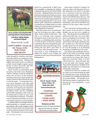 ically through his shoulders and hocks.All of these efforts are required of a dressage horse in large doses. Working withslightly raised poles (such as cavalletti setat their lowest height) requires greaterflexing of knees and hocks and morerounding through the horse%u2019s back.These exercises are particularly goodfor horses who tend to carry themselves%u201chollow,%u201d but they can also be valuable forhorses who are heavy on the forehand,since they must learn to pick up their feet(and by extension, their whole front ends)to clear the poles. It is important, however, not to introduce work with raisedpoles until your horse is very comfortablewith poles on the ground, can consistentlytrot down six or eight of them without extraordinary effort, and has establishedsome rhythm and balance with a rider up.He should also be fairly fit, since workover raised poles is strenuous. even then,sessions should be kept short so as to prevent muscle soreness, as well as sourness.Cavalletti at their lowest height should beadded gradually to a familiar exercise ofground poles, either on the straight or on thecurve of a circle or corner, one at a time, untilyou have reached a maximum of four raisedpoles. The first pole in the exercise shouldalways be a ground pole, so that if yourhorse stumbles or misjudges his distancecoming into the exercise, he will not fall flaton his face. (Making both the first and lastpoles ground poles ensures that you can usethe exercise in both directions.) The distancebetween poles should be approximately thesame as for ground poles (4 1/2 feet, or onehuman %u201cgiant%u201d step), but it is useful to havea ground person available when you try theexercise, to watch your horse and make distance adjustments as necessary.Ride these poles not in two-point position, but in posting trot, with a sympathetic, steady contact on both reins. Theidea is to encourage extra roundnessthrough the spine as the horse lifts overthe poles, so establishing that your horseis on the bit prior to the poles, and thenmaintaining that state through the poleswith steady contact and active legs, is key.Posting the trot allows your horse toround more fully through his back. (Ifyour horse is very weak-backed, youmight even stand in your stirrups, butmaintain an active leg to keep driving thehindquarters.)Some horses will have a tendency tostall out as they reach the poles; this is either indecision as to where to put theirfeet, or resistance to the extra work theyknow raised poles entail. Assertive driving forward with the legs is the cure - andmake sure you are not overdoing the exercise. Most horses enjoy trotting poles inmoderation, and a lot of reluctance mayindicate you have been a little overzealous.Once your horse is strong enough to dothis exercise on the bit and in a steadyrhythm, you can vary it in a number ofways. Place the poles and cavalletti in different areas of the ring - on a curve ratherthan on a straightaway, for example. Varythe number of poles you use. For a fit,mature horse who needs a challenge, turnthe cavalletti up to the half-way height(usually about one foot off the ground).Or vary the spacing so as to encourageshortening or lengthening of the stride. You can also use ground poles and cavalletti at the canter to encourage roundness and lightness of stride - an especiallygood exercise for a horse that tends tolapse into a four-beat canter, or is lazywith his hind end. Space the poles nineto ten feet apart (two human %u201cgiant%u201dsteps) and be prepared to sit lightly in thesaddle, since each effort over a raised polewill feel like a mini jump. A little bit of work over cavalletti willgo a long way towards keeping the mindof a dressage horse fresh, saving the legsof a jumper, and extending the enduranceof a course builder. The humble cavalletto has any number of applications, limited only by your imagination - so getcreative! o46 Arizona Horse Connection March, 2026Horses available sired by Metallics MVP, Dont Stopp Believin, Hickory Holly Time.Cow Horse, Cutting, Ropingand Barrel ProspectsPlease Give Us A Call!DUSTY A RANCH %u2022 Amado, AZB.K. Thwaits, D.V.M. Shelby Thwaits (520) 940-3573SANTORI RANCH%u2022 BOARDING %u2022 IRRIGATED PASTURES%u2022 LESSONS %u2022 HORSE CAMPS%u2022 ARENA RENTALTrainers on SiteSpecializing in lessons for all ages and abilities.Beginner to the show ring! Seasonedschool horses and leases available.955 W. Road 2 North Chino Valley, AZ(928) 848-3659 Santori-Ranch.com