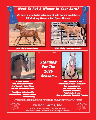 Nelson Farms, Inc.7650 S. Cactus Thorn Ln. %u2022 Tucson, AZ 85747(520) 647-3009 %u2022 nelsonfarmsinc@gmail.comProducing Champions with Versatility and Integrity for 43 Years!LOTSA LIGHTNIN BOLTS2013 CREMELLO AQHA %u2022 15.2 HANDSSire: Lotsa Jetting PepDam: Whata Peppy Goldie(Bloodlines of Driftwood, Peppy San, Doc O%u2019 Lena)Color producing for Buckskin & PalominoWe have a wonderful selection of sale horses available...All Working Western And Sport Horses!AUTISM SAVANT2018 BAY THOROUGHBREDSire: Tourist, G1 Stakes WinnerDam: One Across, Stakes Placed%u2022 Race Winner %u2022 Quiet Disposition%u2022 Fantastic Mover %u2022 Complete Outcross (no line breeding)Want To Put A Winner In Your Barn?Standing For The 2026Season...2025 Filly by Autism Savant 2025 Filly by Lotsa Lightnin BoltsAll photos courtesy of MK Davis