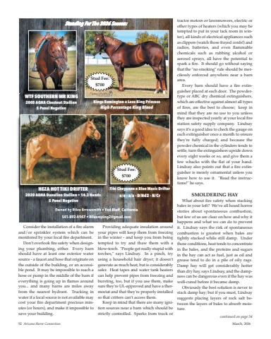Consider the installation of a fire alarmand/or sprinkler system which can bemonitored by your local fire department.Don't overlook fire safety when designing your plumbing, either. Every barnshould have at least one exterior watersource - a faucet and hose that originate onthe outside of the building, or an accessible pond. It may be impossible to reach ahose or pump in the middle of the barn ifeverything is going up in flames aroundyou... and many barns are miles awayfrom the nearest hydrant. Trucking inwater if a local source is not available maycost your fire department precious minutes (or hours), and make it impossible tosave your building.Providing adequate insulation aroundyour pipes will keep them from freezingin the winter - and keep you from beingtempted to try and thaw them with ablow-torch. \torches,\In a pinch, tryusing a household hair dryer; it doesn'tgenerate as much heat, but is considerablysafer. Heat tapes and water tank heaterscan help prevent pipes from freezing andbursting, too, but if you use them, makesure they're UL-approved and have a thermostat and that they're properly installedso that critters can't access them.Keep in mind that there are many ignition sources near a barn which should bestrictly controlled. Sparks from truck ortractor motors or lawnmowers, electric orother types of heaters (which you may betempted to put in your tack room in winter), all kinds of electrical appliances suchas clippers (watch those frayed cords!) andradios, batteries, and even flammablechemicals such as rubbing alcohol oraerosol sprays, all have the potential tospark a fire. It should go without sayingthat the \cilessly enforced anywhere near a barnarea.Every barn should have a fire extinguisher placed at each door. The powdertype or ABC dry chemical extinguishers,which are effective against almost all typesof fires, are the best to choose; keep inmind that they are no use to you unlessthey are inspected yearly at your local firestation safety supply company. Lindsaysays it's a good idea to check the gauge oneach extinguisher once a month to ensurethey're fully charged; and because thepowder chemical in the cylinders tends tosettle, turn the extinguishers upside downevery eight weeks or so, and give them afew whacks with the flat of your hand.Lindsay also points out that a fire extinguisher is merely ornamental unless youknow how to use it. \tions!\SMOLDERING HAYWhat about fire safety when stackingbales in your loft? We've all heard horrorstories about spontaneous combustion,but few of us are clear on how and why ithappens and what we can do to preventit. Lindsay says the risk of spontaneouscombustion is greatest when bales aretightly stacked while still damp. Underthose conditions, heat tends to concentratein the bales, and the proteins and sugarsin the hay can act as fuel, just as oil andgrease tend to do in a pile of oily rags.Damp hay will get considerably hotterthan dry hay, says Lindsay, and the dampness can be dangerous even if the hay waswell-cured before it became damp.Obviously the best solution is never tostack damp hay; but if you must, Lindsaysuggests placing layers of rock salt between the layers of bales to absorb moisture. 52 Arizona Horse Connection March, 2026Standing For The 2026 Season:Stud Fee:$700WTF SOUTHERN MR KING2005 AQHA Chestnut Stallion5 Panel NegativeKings Remington x Leos King PrincessHigh Percentage King BloodOwned by Rilee Arrowsmith %u2022 Red Bluff, California541-892-4947 %u2022 Rileeroping2@gmail.comStud Fee:$700HEZA HOT TIKI DRIFTER2020 AQHA Dunalino Stallion %u2022 14.3 Hands5 Panel NegativeTiki Cheyenne x Blue Music Driftere/e - a/a - D/Nd2 - N/Crcontinued on page 54