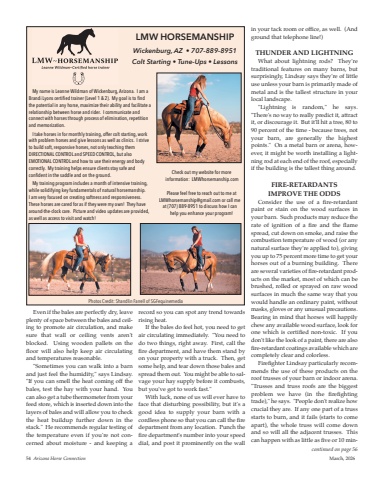 Even if the bales are perfectly dry, leaveplenty of space between the bales and ceiling to promote air circulation, and makesure that wall or ceiling vents aren'tblocked. Using wooden pallets on thefloor will also help keep air circulatingand temperatures reasonable.\and just feel the humidity,\\bales, test the hay with your hand. Youcan also get a tube thermometer from yourfeed store, which is inserted down into thelayers of bales and will allow you to checkthe heat buildup further down in thestack.\the temperature even if you're not concerned about moisture - and keeping arecord so you can spot any trend towardsrising heat.If the bales do feel hot, you need to getair circulating immediately. \do two things, right away. First, call thefire department, and have them stand byon your property with a truck. Then, getsome help, and tear down those bales andspread them out. You might be able to salvage your hay supply before it combusts,but you've got to work fast.\With luck, none of us will ever have toface that disturbing possibility, but it's agood idea to supply your barn with acordless phone so that you can call the firedepartment from any location. Punch thefire department's number into your speeddial, and post it prominently on the wallin your tack room or office, as well. (Andground that telephone line!)THUNDER AND LIGHTNINGWhat about lightning rods? They'retraditional features on many barns, butsurprisingly, Lindsay says they're of littleuse unless your barn is primarily made ofmetal and is the tallest structure in yourlocal landscape.\is random,\\it, or discourage it. But it'll hit a tree, 80 to90 percent of the time - because trees, notyour barn, are generally the highestpoints.\ever, it might be worth installing a lightning rod at each end of the roof, especiallyif the building is the tallest thing around.FIRE-RETARDANTS IMPROVE THE ODDSConsider the use of a fire-retardantpaint or stain on the wood surfaces inyour barn. Such products may reduce therate of ignition of a fire and the flamespread, cut down on smoke, and raise thecombustion temperature of wood (or anynatural surface they're applied to), givingyou up to 75 percent more time to get yourhorses out of a burning building. Thereare several varieties of fire-retardant products on the market, most of which can bebrushed, rolled or sprayed on raw woodsurfaces in much the same way that youwould handle an ordinary paint, withoutmasks, gloves or any unusual precautions.Bearing in mind that horses will happilychew any available wood surface, look forone which is certified non-toxic. If youdon't like the look of a paint, there are alsofire-retardant coatings available which arecompletely clear and colorless.Firefighter Lindsay particularly recommends the use of these products on theroof trusses of your barn or indoor arena.\problem we have (in the firefightingtrade),\crucial they are. If any one part of a trussstarts to burn, and it fails (starts to comeapart), the whole truss will come downand so will all the adjacent trusses. Thiscan happen with as little as five or 10 min54 Arizona Horse Connection March, 2026LMW HORSEMANSHIPWickenburg, AZ %u2022 707-889-8951Colt Starting %u2022 Tune-Ups %u2022 LessonsMy name is Leanne Wildman of Wickenburg, Arizona. I am aBrandi Lyons certified trainer (Level 1 & 2). My goal is to find the potential in any horse, maximize their ability and facilitate a relationship between horse and rider. I communicate and connect with horses through process of elimination, repetitionand memorization. I take horses in for monthly training, offer colt starting, workwith problem horses and give lessons as well as clinics. I striveto build soft, responsive horses, not only teaching them DIRECTIONAL CONTROL and SPEED CONTROL, but alsoEMOTIONAL CONTROL and how to use their energy and body correctly. My training helps ensure clients stay safe andconfident in the saddle and on the ground.My training program includes a month of intensive training,while solidifying key fundamentals of natural horsemanship. I am very focused on creating softness and responsiveness.These horses are cared for as if they were my own! They havearound-the-clock care. Picture and video updates are provided,as well as access to visit and watch!Check out my website for moreinformation: LMWhorsemanship.comPlease feel free to reach out to me atLMWhorsemanship@gmail.com or call meat (707) 889-8951 to discuss how I can help you enhance your program!Photos Credit: Shandlin Farrell of SGFequinemediacontinued on page 56