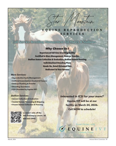 Why Choose Us?Experienced full time breeding facilityCertified in Mare Management, Embryo Transfer, Stallion Semen Collection & Evaluation, Stallion Semen FreezingIndividualized Breeding PlansHands On, Detail Oriented CareDedicated To Your SuccessMare Services:%u2022 Reproductive Cycle Management%u2022 Artificial Insemination (Cooled & Frozen)%u2022 Embryo Flushing & Transfer%u2022 Breeding Soundness%u2022 ICSI (Provided by Equine IVF)Stallion Services:%u2022 Semen Collection & Evaluation%u2022 Cooled Semen Processing & Shipping%u2022 Frozen Semen Collection & FreezingInterested in ICSI for your mare?Equine IVF will be at our facility on March 24, 2026.Call NOW to schedule!Located 1 mile off the 202 Freeway in Laveen, AZ602-663-3996March, 2026 Arizona Horse Connection 59