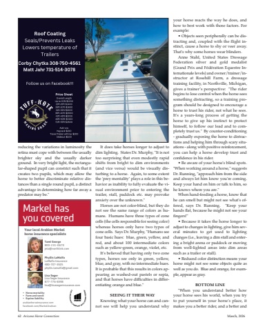 reducing the variations in luminosity theretina must cope with between the usuallybrighter sky and the usually darkerground. In very bright light, the rectangular-shaped pupil can constrict such that itcreates two pupils, which may allow thehorse to better discriminate relative distances than a single round pupil, a distinctadvantage in determining how far away apredator may be.\It does take horses longer to adjust todim lighting. States Dr. Murphy, \too surprising that even modestly rapidshifts from bright to dim environments(and vice versa) would be visually disturbing to a horse. Again, to some extentthe 'prey mentality%u2019 plays a role in this behavior as inability to fully evaluate the visual environment prior to entering thetrailer, stall, paddock etc. may provokeanxiety over the unknown.\Horses are not color-blind, but they donot see the same range of colors as humans. Humans have three types of conecells (the cells responsible for seeing color)whereas horses only have two types ofcone cells. Says Dr. Murphy, \four basic hues: blue, green, yellow, andred, and about 100 intermediate colorssuch as yellow-green, orange, violet, etc. It's believed that having only two conetypes, horses see only in green, yellow,blue, and gray, with no intermediate hues.It is probable that this results in colors appearing as washed-out pastels or sepia,and that horses have difficulties in differentiating orange and blue.\SEEING IT THEIR WAYKnowing what your horse can and cannot see will help you understand whyyour horse reacts the way he does, andhow to best work with those factors. Forexample:%u2022 Objects seen peripherally can be distracting and, coupled with the flight instinct, cause a horse to shy or veer away.That's why some horses wear blinders. Anne Stahl, United States DressageFederation silver and gold medalist(Grand Prix and F%u00e9d%u00e9ration Equestre Internationale levels) and owner/trainer/instructor at Rosehill Farm, a dressagetraining facility, in Northville, Michigan,gives a trainer%u2019s perspective: \begins to lose control when the horse seessomething distracting, so a training program should be designed to encourage ahorse to trust his rider, not what he sees.It's a years-long process of getting thehorse to give up his instinct to protecthimself, to follow our lead and to completely trust us.\- gradually exposing the horse to distractions and helping him through scary situations - along with positive reinforcement,you can help a horse develop trust andconfidence in his rider. %u2022 Be aware of your horse's blind spots.\Dr. Running, \and always let him know you're coming.Keep your hand on him or talk to him, sohe knows where you are.\When hand-feeding a horse, know thathe can smell but might not see what's offered, says Dr. Running. \hands flat, because he might not see yourfingers!\%u2022 Because it takes the horse longer toadjust to changes in lighting, give him several minutes to get used to lightingchanges (i.e., leaving a dim stall and entering a bright arena or paddock or movingfrom well-lighted areas into dim areassuch as a trailer or stall).%u2022 Reduced color distinction means yourhorse might not see some objects quite aswell as you do. Blue and orange, for example, appear as gray.BOTTOM LINE\your horse sees his world, when you tryto put yourself in your horse's place, itmakes you a better rider, and a better and62 Arizona Horse Connection March, 2026Markel has you covered%u2022 Horse mortality%u2022 Farm and ranch%u2022 Equine liabilityarabianhorseinsurance.comfacebook.com/MarkelArabianYour local \IPSTF%u0001insurance specialistsTami George800-231-0670jeta@northlink.comPhyllis LaMalfaLaMalfa Insurance 480-707-3505phyllis.lamalfa@gmail.comLisa SegerLisa Seger Insurance 877-776-8398lisa@lisasegerinsurance.com