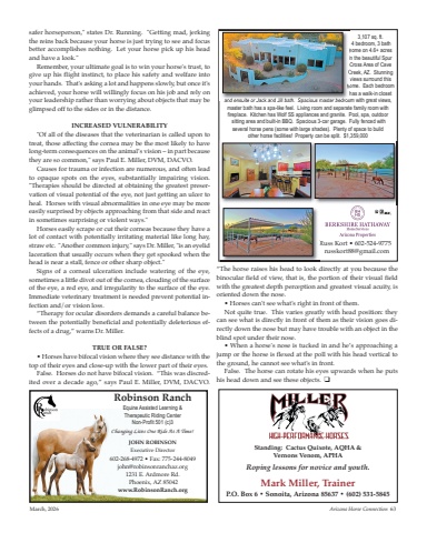 safer horseperson,\the reins back because your horse is just trying to see and focusbetter accomplishes nothing. Let your horse pick up his headand have a look.\Remember, your ultimate goal is to win your horse's trust, togive up his flight instinct, to place his safety and welfare intoyour hands. That's asking a lot and happens slowly, but once it'sachieved, your horse will willingly focus on his job and rely onyour leadership rather than worrying about objects that may beglimpsed off to the sides or in the distance.INCREASED VULNERABILITY\treat, those affecting the cornea may be the most likely to havelong-term consequences on the animal%u2019s vision %u2013 in part becausethey are so common,\Causes for trauma or infection are numerous, and often leadto opaque spots on the eyes, substantially impairing vision.\vation of visual potential of the eye, not just getting an ulcer toheal. Horses with visual abnormalities in one eye may be moreeasily surprised by objects approaching from that side and reactin sometimes surprising or violent ways.\Horses easily scrape or cut their corneas because they have alot of contact with potentially irritating material like long hay,straw etc. \laceration that usually occurs when they get spooked when thehead is near a stall, fence or other sharp object.\Signs of a corneal ulceration include watering of the eye,sometimes a little divot out of the cornea, clouding of the surfaceof the eye, a red eye, and irregularity to the surface of the eye.Immediate veterinary treatment is needed prevent potential infection and/or vision loss. %u201cTherapy for ocular disorders demands a careful balance between the potentially beneficial and potentially deleterious effects of a drug,%u201d warns Dr. Miller.TRUE OR FALSE?%u2022 Horses have bifocal vision where they see distance with thetop of their eyes and close-up with the lower part of their eyes. False. Horses do not have bifocal vision. %u201cThis was discredited over a decade ago,%u201d says Paul E. Miller, DVM, DACVO.%u201cThe horse raises his head to look directly at you because thebinocular field of view, that is, the portion of their visual fieldwith the greatest depth perception and greatest visual acuity, isoriented down the nose. %u2022 Horses can't see what's right in front of them. Not quite true. This varies greatly with head position: theycan see what is directly in front of them as their vision goes directly down the nose but may have trouble with an object in theblind spot under their nose.%u2022 When a horse's nose is tucked in and he%u2019s approaching ajump or the horse is flexed at the poll with his head vertical tothe ground, he cannot see what's in front. False. The horse can rotate his eyes upwards when he putshis head down and see these objects. oMarch, 2026 Arizona Horse Connection 63Standing: Cactus Quixote, AQHA & Vernons Venom, APHARoping lessons for novice and youth.Mark Miller, TrainerP.O. Box 6 %u2022 Sonoita, Arizona 85637 %u2022 (602) 531-58453,107 sq. ft.4 bedroom, 3 bathhome on 4.6+ acresin the beautiful SpurCross Area of CaveCreek, AZ. Stunningviews surround thishome. Each bedroomhas a walk-in closetand ensuite or Jack and Jill bath. Spacious master bedroom with great views,master bath has a spa-like feel. Living room and separate family room with fireplace. Kitchen has Wolf SS appliances and granite. Pool, spa, outdoorsitting area and built-in BBQ. Spacious 3-car garage. Fully fenced with several horse pens (some with large shades). Plenty of space to build other horse facilities! Property can be split. $1,359,000Russ Kort %u2022 602-524-9775russkort88@gmail.comRobinson RanchEquine Assisted Learning & Therapeutic Riding CenterNon-Profit 501 (c)3Changing Lives One Ride At A Time!JOHN ROBINSONExecutive Director602-268-4972 %u2022 Fax: 775-244-8049john@robinsonranchaz.org1231 E. Ardmore Rd. Phoenix, AZ 85042www.RobinsonRanch.org