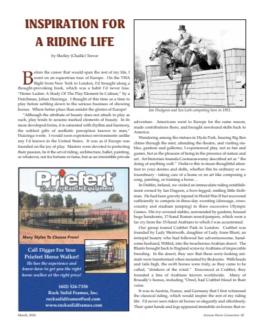 Before the career that would span the rest of my life, Iwent on an equestrian tour of Europe. On the TWAflight from New York to London, I%u2019d brought along athought-provoking book, which was a habit I%u2019d never lose.%u201cHomo Luden: A Study Of The Play Element In Culture,%u201d by aDutchman, Johan Huizinga. I thought of this time as a time toplay before settling down to the serious business of showinghorses. Where better place than amidst the glories of Europe!%u201cAlthough the attribute of beauty does not attach to play assuch, play tends to assume marked elements of beauty. In itsmore developed forms, it is saturated with rhythm and harmony,the noblest gifts of aesthetic perception known to man,%u201dHuizinga wrote. I would soon experience environments unlikeany I%u2019d known in the United States. It was as if Europe wasfounded on the joy of play. Masters were devoted to perfectingtheir passion, be it the art of riding, architecture, ballet, painting,or whatever, not for fortune or fame, but as an irresistible privateadventure. Americans went to Europe for the same reason,made contributions there, and brought newfound skills back toAmerica.Wandering among the statues in Hyde Park, hearing Big Benchime through the mist, attending the theatre, and visiting stables, gardens and galleries, I experienced play, not as fun andgames, but as the pleasure of being in the presence of nature andart. Art historian Ananda Coomaraswamy described art as %u201c thedoing of anything well.%u201d I believe this to mean thoughtful attention to your desires and skills, whether this be ordinary or extraordinary - taking care of a home or an art like composing asong, painting, or training a horse%u2026In Dublin, Ireland, we visited an immaculate riding establishment owned by Ian Dugeon, a bow-legged, smiling little Irishman. He had been gravely injured in World War II but recoveredsufficiently to compete in three-day eventing (dressage, crosscountry and stadium jumping) in three successive OlympicGames. His ivy-covered stables, surrounded by gardens, housedhuge handsome, 17-hand Roman nosed-jumpers, which were afar cry from the 15-hand Arabians to which I was accustomed.Our group toured Crabbet Park in London. Crabbet wasfounded by Lady Wentwoth, daughter of Lady Anne Blunt, anintrepid beauty who had followed her adventuresome, handsome husband, Wilfrid, into the treacherous Arabian desert. TheBlunts brought back to England scrawny Arabians of impeccablebreeding. In the desert, they saw that these sorry-looking animals were transformed when mounted by Bedouins. With headsand tails high, the swift horses were truly, as they came to becalled, %u201cdrinkers of the wind.%u201d Ensconced at Crabbet, theyfounded a line of Arabians known worldwide. Many ofBrusally%u2019s horses, including *Orzel, had Crabbet blood in theirveins.It was in Austria, France, and Germany that I first witnessedthe classical riding, which would inspire the rest of my ridinglife. I%u2019d never seen riders sit horses so elegantly and effortlessly.Their quiet hands and legs appeared immobile on horses that reIan Dudgeon and Sea Lark competing here in 1951.INSPIRATION FOR A RIDING LIFEby Shelley (Chaille) Trevor March, 2026 Arizona Horse Connection 65Call Digger For YourPriefert Horse Walker!He has the experience and know-how to get you the righthorse walker at the right price!(602) 524-7338Rock Solid Frames, Inc.rocksolidframes@aol.comwww.rocksolidframes.comMany Styles To Choose From!
