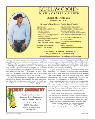 sponded with utmost grace, concentration and control. European dressage was a far cry from American styles of saddle-seatand Western that I%u2019d seen and been practicing in Arizona.At the Spanish Riding School in Austria, it was standing roomonly to watch Lipizzaner stallions bearing tall, still uniformedriders dance to the music of a symphony orchestra in the resplendent Baroque riding hall. I was moved to tears. Here,Huizinga%u2019s words were living examples of play as %u201cmarked elements of beauty saturated with rhythm and harmony.%u201dIn France, the French Calvary at Samour gave an exhibitionof high school dressage almost equal to that of the Spanish Riding School. We were then served lunch as only the French can -assorted gourmet courses accompanied by the appropriate wine.In Germany, we watched Olympic gold medalist Joseph Neckermann compete at an international show. Afterward, he treatedus to an exhibition and light lunch at his elegant stable facility.His gentle manner and twinkling eyes expressed the happinesshe felt for horses and the art of riding.In Spain, a country of bravado, we watched Cavalry ridersslide down 150 or 160 feet of an eight percent grade that lookedvertical. With some trepidation, we half-expected to see themdrop to their deaths. Contrary to what one might expect, riderssat in a forward seat position, which allowed their horses freedom to use their hindquarters for this downhill %u201cgallop.%u201dBeauty, courage and nobility were to be seen throughout Europe. It was the result of centuries of dedication to architecture,art, and the breeding of fine horses. Art was an everyday affair,from dining to exquisite riding, especially in France. Their artswere to be savored and never rushed. Europe%u2019s Old-World sensibility and aesthetic would inspire the rest of my life. oShelley's recent books, A Riding Life %u2013 Memories, Dreams, Art and Love, also A Wordsmith %u2013 Intimate Glimpses into the Lifeand Work of Elleston Trevor, may be found on Amazon. Her book,The Heart of the Horse %u2013 How to Know Them, How to Ride Them,How to Love Them is available on Amazon, Barnes and Noble, and at Greenway Saddlery. Just released and available on Amazon and Barnes and Noble is Magical Riding - Connecting with the Extraordinary Nature of Horses. 66 Arizona Horse Connection March, 2026EQUINE LAW:CONTRACTS & DISPUTES%u2022 Liability Waivers%u2022 Boarding Contracts%u2022 Purchase and Sale Agreements%u2022 Training Contracts%u2022 Partnerships and Syndications%u2022 Breeding Contracts%u2022 USEF and Breed Registry MattersDISPUTE RESOLUTION& CIVIL LITIGATIONGOVERNMENT RELATIONS& REGULATORY COMPLIANCE%u2022 Zoning and Land Use Issues%u2022 Agricultural Property Tax Exemptions%u2022 Well Permits and Water Rights IssuesREAL ESTATE & COMMERCIAL TRANSACTIONS%u2022 Acquisition and Dispositions%u2022 Leasing%u2022 Entity Formation%u2022 Financing and Seller Carry Backs7144 E. Stetson Dr., Suite 300 %u2022 Scottsdale, AZDirect: 480.240.5647 %u2022 Cell: 602.402.3335ATrenk@RoseLawGroup.com %u2022 www.RoseLawGroup.comAdam M. Trenk, Esq.Licensed in AZ, OK, KY%u201cArizona%u2019s Most Robust Equine Law Practice%u201dEnglish & Western TackComplete Repair DepartmentTom & Darlene DroskeCorner Gilbert & Ray Rd.1605 S. Gilbert Rd.Gilbert, Arizona 85234(480) 899-7521