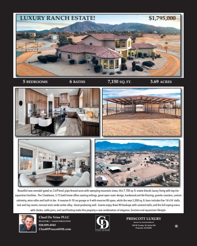 5 BeDrOOMs 6 BATHs 7,150 sQ. FT.Beautiful new remodel gated on 3.69 level, pipe-fenced acres with sweeping mountain views, this 7,150 sq. ft. estate blends luxury living with top-tierequestrian facilities. The 5-bedroom, 5.75 bath home offers soaring ceilings, great open room design, hardwood and tile flooring, granite counters, customcabinetry, wine cellar and built-in bar. A massive 8%u201310 car garage or 4 with massive RV space, while the new 3,200 sq. ft. barn includes five 16%u2019x16%u2019 stalls,tack and hay rooms, turnout and a wide center alley. Great producing well. Guests enjoy three RV hookups with covered stalls, and the full roping arena with chutes, cattle pens, and sand footing make this property a rare combination of elegance, function and equestrian lifestyle.chad De Vries PLLcreALTOr%u00ae | sALes eXecUTIVe928.899.4543chad@Prescott928.comPrescOTT LUXUrY reALTY & INVesTMeNTs130 W Gurley st, suite 302 Prescott, AZ 86301LUXUrY rANcH esTATe! $1,795,0003.69 Acres