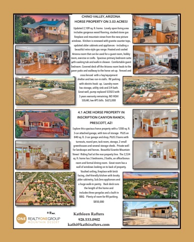 Kathleen Rafters 928.533.0902kathi@kathirafters.comUpdated 2,109 sq. ft. home. Lovely open living area includes gorgeous wood flooring, stacked stone gas fireplace and mountain views from the new picture windows. Kitchen is renewed with granite counter tops,updated alder cabinets and appliances - including abeautiful retro-style gas range. Heated and cooled Arizona room that can be used for a guest room, hobbyroom, exercise or crafts. Spacious primary bedroom suitewith soaking tub and walk-in shower. Comfortable guestbedroom. Covered deck off the Arizona room leads to thepaver patio and walkway to the horse set-up. Fenced andcross fenced with a hay/equipmentshelter and two run-in stalls. RV parkingwith electric hook- up. Laundry roomhas storage, utility sink and 3/4 bath.Great well, pump replaced 5/2023 with3 years warranty remaining. NO HOA!SOLAR, low APS bills. $625,000CHINO VALLEY, ARIZONAHORSE PROPERTY ON 3.03 ACRES!Explore this spacious horse property with a 1200 sq. ft.3-car attached garage, with tons of storage. PLUS an840 sq. ft. 2-car garage and shop, PLUS 2 barns withturnouts, round pen, tack room, storage, 2 small greenhouses and several storage sheds. Private well for landscape and horses. Beautiful Granite MountainViews! Riding Trail at the rear property line. The 2,534sq. ft. home has 3 bedrooms, 2 baths, an office/bonusroom and formal dining room. Great room has a wall of windows looking on to back of property. Vaulted ceiling, fireplace with brick facing, chef-friendly kitchen with knottyalder cabinetry, Sub Zero appliances anda huge walk-in pantry. Back deck runsthe length of the home andincludes three pergolas and a built-inBBQ. Plenty of room for RV parking. $850,0004.1 ACRE HORSE PROPERTY IN INSCRIPTION CANYON RANCH,PRESCOTT, AZ!