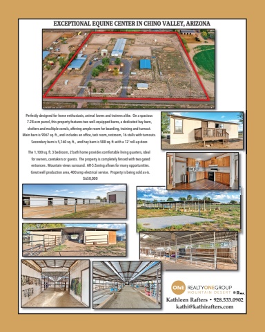 Kathleen Rafters %u2022 928.533.0902kathi@kathirafters.comEXCEPTIONAL EQUINE CENTER IN CHINO VALLEY, ARIZONAPerfectly designed for horse enthusiasts, animal lovers and trainers alike. On a spacious 7.28 acre parcel, this property features two well-equipped barns, a dedicated hay barn, shelters and multiple corrals, offering ample room for boarding, training and turnout. Main barn is 9067 sq. ft., and includes an office, tack room, restroom, 16 stalls with turnouts. Secondary barn is 5,160 sq. ft., and hay barn is 588 sq. ft. with a 12%u2019 roll-up door. The 1,100 sq. ft. 3 bedroom, 2 bath home provides comfortable living quarters, idealfor owners, caretakers or guests. The property is completely fenced with two gatedentrances . Mountain views surround. AR-5 Zoning allows for many opportunities. Great well production area, 400 amp electrical service. Property is being sold as-is. $650,000