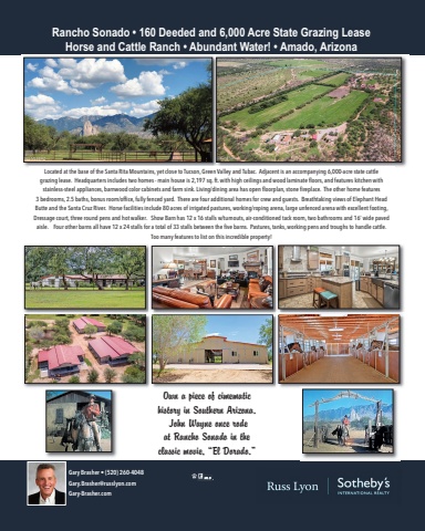 Rancho Sonado %u2022 160 Deeded and 6,000 Acre State Grazing LeaseHorse and Cattle Ranch %u2022 Abundant Water! %u2022 Amado, ArizonaGary Brasher %u2022 (520) 260-4048Gary.Brasher@russlyon.com Gary-Brasher.comLocated at the base of the Santa Rita Mountains, yet close to Tucson, Green Valley and Tubac. Adjacent is an accompanying 6,000-acre state cattle grazing lease. Headquarters includes two homes - main house is 2,197 sq. ft. with high ceilings and wood laminate floors, and features kitchen with stainless-steel appliances, barnwood color cabinets and farm sink. Living/dining area has open floorplan, stone fireplace. The other home features 3 bedrooms, 2.5 baths, bonus room/office, fully fenced yard. There are four additional homes for crew and guests. Breathtaking views of Elephant Head Butte and the Santa Cruz River. Horse facilities include 80 acres of irrigated pastures, working/roping arena, large unfenced arena with excellent footing, Dressage court, three round pens and hot walker. Show Barn has 12 x 16 stalls w/turnouts, air-conditioned tack room, two bathrooms and 16%u2019 wide pavedaisle. Four other barns all have 12 x 24 stalls for a total of 33 stalls between the five barns. Pastures, tanks, working pens and troughs to handle cattle. Too many features to list on this incredible property! Own a piece of cimematic history in Southern Arizona.John Wayne once rode at Rancho Sonado in the classic movie, %u201cEl Dorado.%u201d