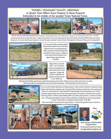 2.12 acres with utilities already installed.RV pad with awesome views of the TontoNational Forest surrounding Pleasant Valley, to park your horse-hauling trailerand settle in for the summer. Saddle upon site and exit the back gate to ride adjacent forest roads and trails.$165,000 Renee Zeising %u2022 (928) 978-4506Designated BrokerThe Young, AZ Specialist for 34 years!YoungRealtyPartners@gmail.comYOUNG / PLEASANT VALLEY, ARIZONA!A Quaint Town Where Every Property Is Horse Property!Embedded in the middle of the wooded Tonto National Forest.Ride for miles and miles along wooded trails. Compete in monthly gymkhana events. Master team roping in our community-owned arena. Cool off in swimming holes along our perennial creeks. Explore native American ruins and surprise the elk, deer, wild turkeys and other wildlife during your outdoor adventures. Or let your retired horses languish in fresh air through a moderate 4-season climate. All properties in the town of Young are horse properties!!Nearly level 5 acres with3200 + sq. ft. decorativeblock home designed andconstructed for year-roundenjoyment. Garage withwalled-in workshop andseparate mechanical roomis over 1300 sq. ft. Detached steel building would make a perfect feed storage and tack shed. Plenty of room to add corrals and run-in sheds. Seller owns adjacent undeveloped 5 acres if you need more pasture. Call listing broker for price and terms.3.62 acres with multiple dwellings and sleeping options! Main residence features a firewood burningfireplace with downstairs sleeping nook, 2nd ground floor sleeping area that exits to the wrap-arounddeck, plus a very private loft. Huge detached, finished garage has private bedroom and 1/2 bath. Caretaker cottage tucked into the back of the parcel features a king bed and full bath with a walk-in, 6-foot long shower. Treehouse-style dwelling offers yet another guest quarters, or convert it to otheruses. 2nd garage with attached carport and huge greenhouse buildings can serve many purposes as well! Private trails are nearby for riding and hikes. $725,000.Seller owns adjacent 10 acres that he may sell with it! Contact listing broker for price and terms.Caretakers%u2019 Cottage