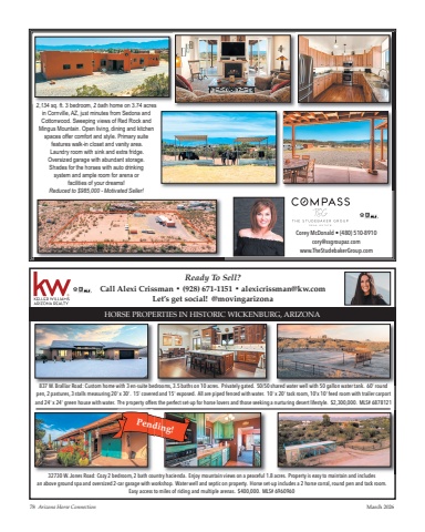 78 Arizona Horse Connection March 20262,134 sq. ft. 3 bedroom, 2 bath home on 3.74 acresin Cornville, AZ, just minutes from Sedona and Cottonwood. Sweeping views of Red Rock and Mingus Mountain. Open living, dining and kitchenspaces offer comfort and style. Primary suitefeatures walk-in closet and vanity area. Laundry room with sink and extra fridge. Oversized garage with abundant storage. Shades for the horses with auto drinking system and ample room for arena or facilities of your dreams! Reduced to $985,000 - Motivated Seller!Corey McDonald %u2022 (480) 510-8910cory@ssgroupaz.comwww.TheStudebakerGroup.comHORSE PROPERTIES IN HISTORIC WICKENBURG, ARIZONAReady To Sell?Call Alexi Crissman %u2022 (928) 671-1151 %u2022 alexicrissman@kw.comLet%u2019s get social! @movingarizona837 W. Bralliar Road: Custom home with 3 en-suite bedrooms, 3.5 baths on 10 acres. Privately gated. 50/50 shared water well with 50 gallon water tank. 60' roundpen, 2 pastures, 3 stalls measuring 20' x 30'. 15' covered and 15' exposed. All are piped fenced with water. 10' x 20' tack room, 10'x 10' feed room with trailer carportand 24' x 24' green house with water. The property offers the perfect set-up for horse lovers and those seeking a nurturing desert lifestyle. $2,300,000. MLS# 687812132730 W. Jones Road: Cozy 2 bedroom, 2 bath country hacienda. Enjoy mountain views on a peaceful 1.8 acres. Property is easy to maintain and includes an above ground spa and oversized 2-car garage with workshop. Water well and septic on property. Horse set-up includes a 2 horse corral, round pen and tack room.Easy access to miles of riding and multiple arenas. $400,000. MLS# 6960960Pending!