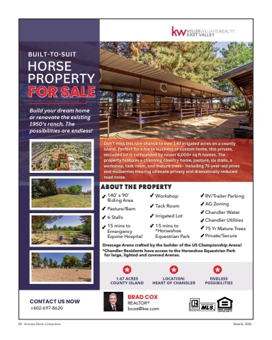 80 Arizona Horse Connection March, 2026ABOUT THE PROPERTYWorkshopTack RoomIrrigated Lot15 mins to*HorseshoeEquestrian ParkRV/Trailer ParkingAG ZoningChandler WaterChandler Utilities75 Yr Mature TreesPrivate/Secure140%u2019 x 90%u2019Riding AreaPasture/Barn6 Stalls15 mins to Emergency Equine HospitalDressage Arena crafted by the builder of the US Championship Arena!*Chandler Residents have access to the Horseshoe Equestrian Parkfor large, lighted and covered Arenas.33333333333333+602-697-8620REALTOR%u00aebcox@kw.com