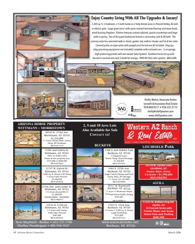82 Arizona Horse Connection March 20262,320 sq. ft., 4 bedroom, 2.5 bath home on 2 fully fenced acres in Prescott Valley, AZ withan electric gate. Large great room with warm-colored laminate flooring and stone faced,wood-burning fireplace. Kitchen features custom cabinets, quartz countertops and largewalk-in pantry. Two of the guest bedrooms feature a connecting Jack & Jill bath. The primary suite has oversized walk-in closet, garden tub, walk-in shower and his & her sinks.Covered patio, an open patio with pergola and hot tub are all included. Dog spa (dog grooming equipment not included) complete with enclosed runs. 3-car garage,high producing private well and owned Solar System! Excellent horse set-up with fenced-in covered area and 2 sheds for storage. PAID-IN-FULL solar system! $865,000Shelly Watne, Associate BrokerIannelli & Associates Real Estate928-848-0511 %u2022 928-237-2112 shelly@shellywatne.com www.shellywatne.com Enjoy Country Living With All The Upgrades & Luxury!ARIZONA HORSE PROPERTYWITTMANN - MORRISTOWNBUCKEYE LITCHFIELD PARKAGUILA2, 5 and 10 Acre LotsAlso Available for SaleCONTACT US!Terri Mayfield - Broker %u2022 602-525-3706 www.wazrealestate.netShelley Pendergast %u2022 480-398-5927 Buckeye, AZ 8532640342 N. 253rd Ave.Morristown, AZ 85342$1,224,0003+ Acres, Home, Barn, Arena,Shop, RV HookupsMLS 6914118218th and Galvin St.Wittmann, AZ 85361TWO 10 ACRE LOTSPower at the property line$525,000 or $600,000MLS 687046421747 W. Galvin St.Wittmann, AZ 853613,800 sq. ft. Home & RV Shop5 Acres Fully Fenced$2,500,000MLS 6928396215th Ave. and Center St.Wittmann, AZ 8536113.2 Acres Zoned RU-43$1,200,000Subdividable - BuildableMLS 696051333524 N. 215th Dr.Wittmann, AZ 853612.5 Acres with CasitaFully Pipe Fenced$585,000MLS 682422116218 W. Carole LaneLitchfield, AZHouse, Barn, Arena2.4 Acres %u2022 $1,790,000MLS 696233451252 W. Buffalo Dog Rd.Aguila, AZ10 Fenced Acres withPrivate Water and ArenaHorse Pens and Parking$685,0005604 S. 225th Ave.Buckeye, AZ 85326Huge Custom Home and PoolArena, Barn, RV Storage3+ Acres %u2022 $1,465,000MLS 69270092300 S. Jack Rabbit TrailBuckeye, AZ 853265 Irrigated AcresHome, Shop, Road Frontage$1,400,000MLS 693769130317 W. RooseveltBuckeye, AZ 853261+ Acre %u2022 3 Bedroom HomeCovered Horse Stalls, Riding$599,000MLS 689801413933 S. 191st Ave.Buckeye, AZ 853262.5 Acres %u2022 2,200 sq. ft. HomeLarge Workshop$574,000MLS 6931444