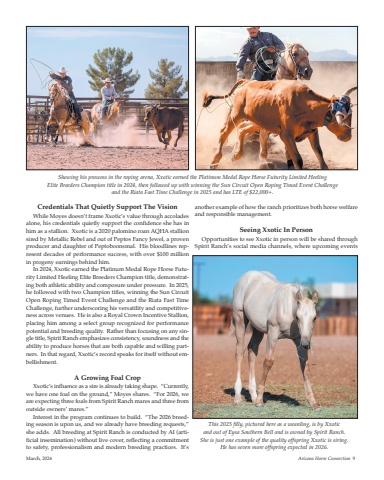 credentials that Quietly Support the VisionWhile Moyes doesn%u2019t frame Xxotic%u2019s value through accoladesalone, his credentials quietly support the confidence she has inhim as a stallion. Xxotic is a 2020 palomino roan AQHA stallionsired by Metallic Rebel and out of Peptos Fancy Jewel, a provenproducer and daughter of Peptoboonsmal. His bloodlines represent decades of performance success, with over $100 millionin progeny earnings behind him.In 2024, Xxotic earned the Platinum Medal Rope Horse Futurity Limited Heeling Elite Breeders Champion title, demonstrating both athletic ability and composure under pressure. In 2025,he followed with two Champion titles, winning the Sun CircuitOpen Roping Timed Event Challenge and the Riata Fast TimeChallenge, further underscoring his versatility and competitiveness across venues. He is also a Royal Crown Incentive Stallion,placing him among a select group recognized for performancepotential and breeding quality. Rather than focusing on any single title, Spirit Ranch emphasizes consistency, soundness and theability to produce horses that are both capable and willing partners. In that regard, Xxotic%u2019s record speaks for itself without embellishment.A Growing Foal cropXxotic%u2019s influence as a sire is already taking shape. %u201cCurrently,we have one foal on the ground,%u201d Moyes shares. %u201cFor 2026, weare expecting three foals from Spirit Ranch mares and three fromoutside owners%u2019 mares.%u201dInterest in the program continues to build. %u201cThe 2026 breeding season is upon us, and we already have breeding requests,%u201dshe adds. All breeding at Spirit Ranch is conducted by AI (artificial insemination) without live cover, reflecting a commitmentto safety, professionalism and modern breeding practices. It%u2019sanother example of how the ranch prioritizes both horse welfareand responsible management.Seeing Xxotic in PersonOpportunities to see Xxotic in person will be shared throughSpirit Ranch%u2019s social media channels, where upcoming eventsMarch, 2026 Arizona Horse Connection 9Showing his prowess in the roping arena, Xxotic earned the Platinum Medal Rope Horse Futurity Limited Heeling Elite Breeders Champion title in 2024, then followed up with winning the Sun Circuit Open Roping Timed Event Challenge and the Riata Fast Time Challenge in 2025 and has LTE of $22,000+.This 2025 filly, pictured here as a weanling, is by Xxotic and out of Eysa Southern Bell and is owned by Spirit Ranch. She is just one example of the quality offspring Xxotic is siring.He has seven more offspring expected in 2026.